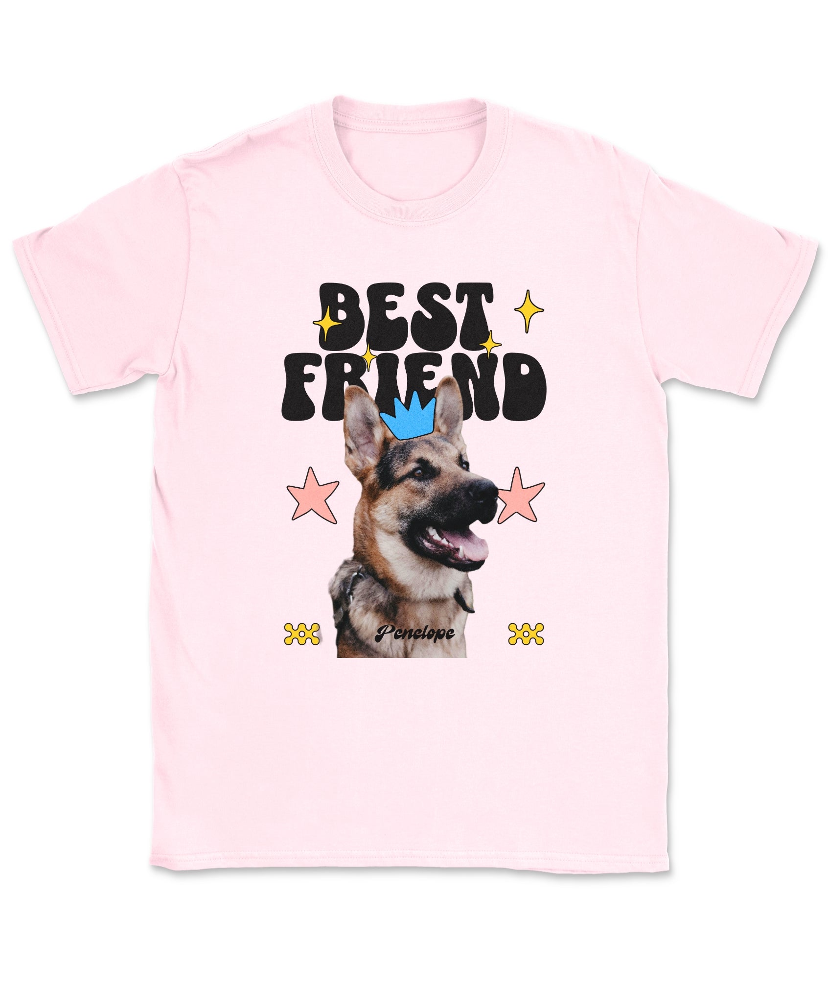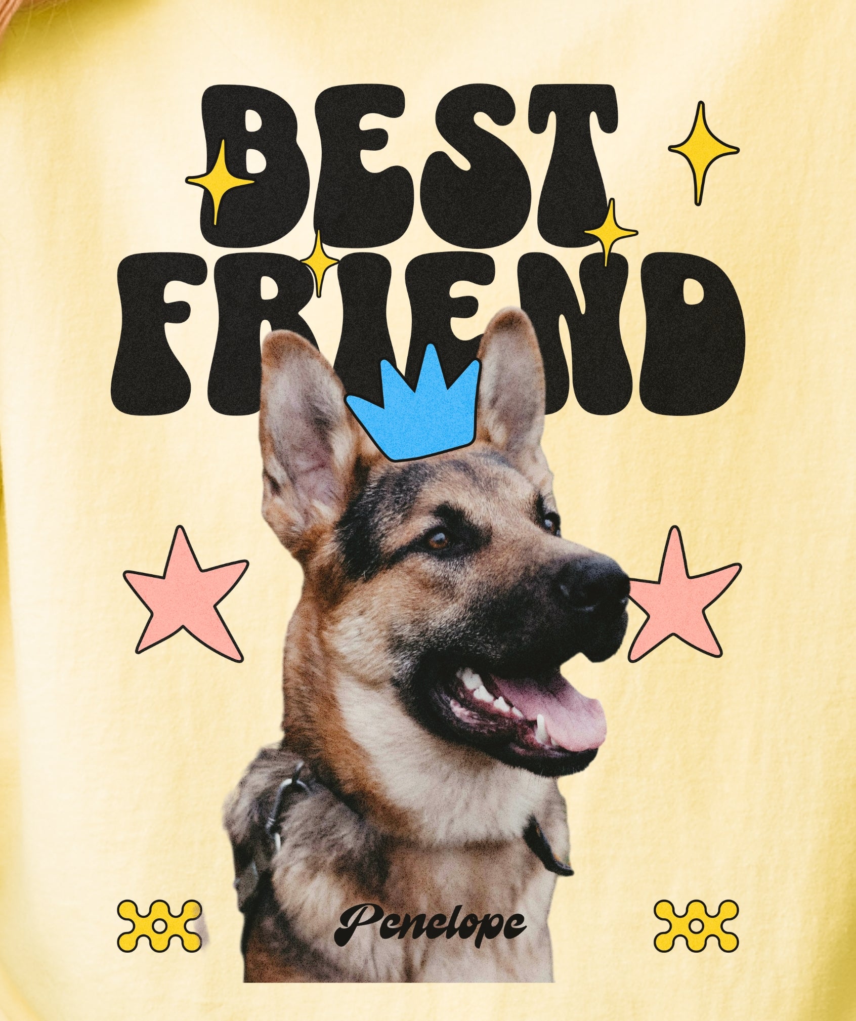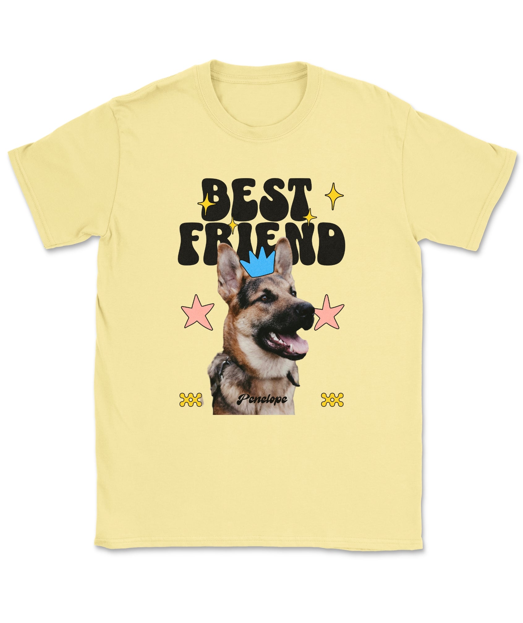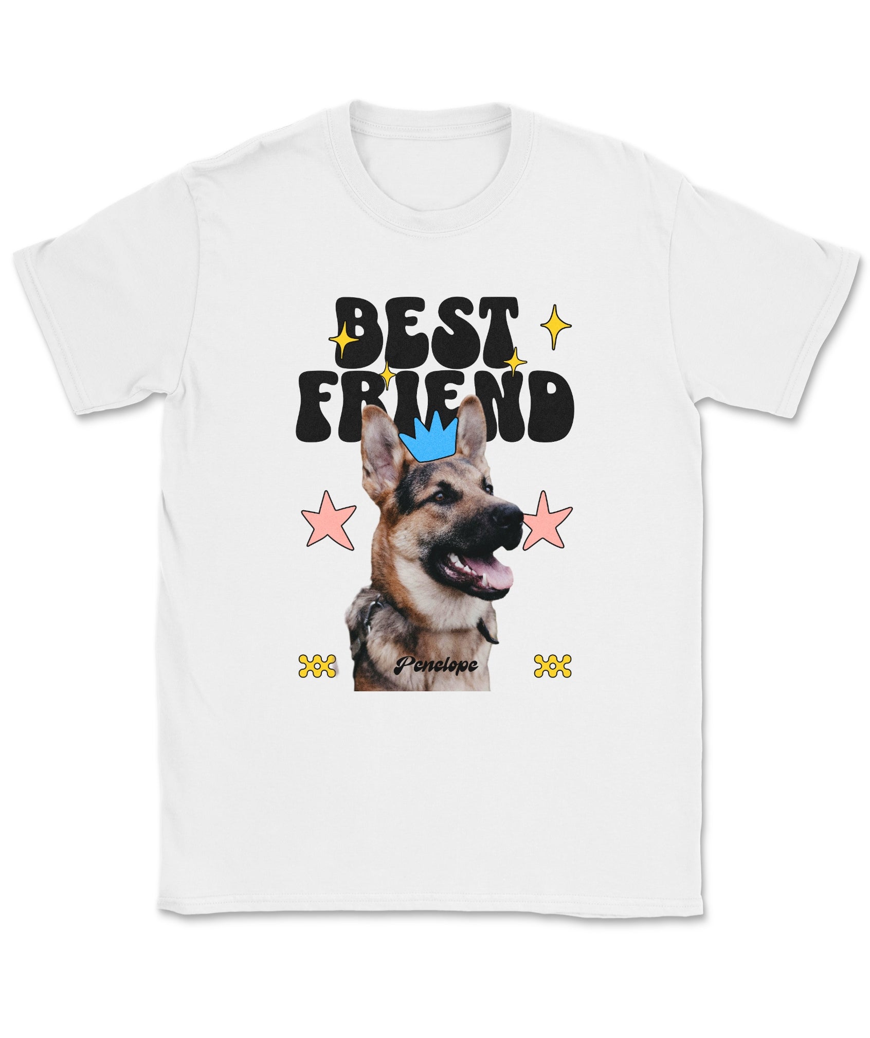 Your dog is your ride-or-die—and now your wardrobe knows it. This custom tee features your pup’s photo and name, decked out with groovy shapes, bright stars, and bold “Best Friend” lettering.