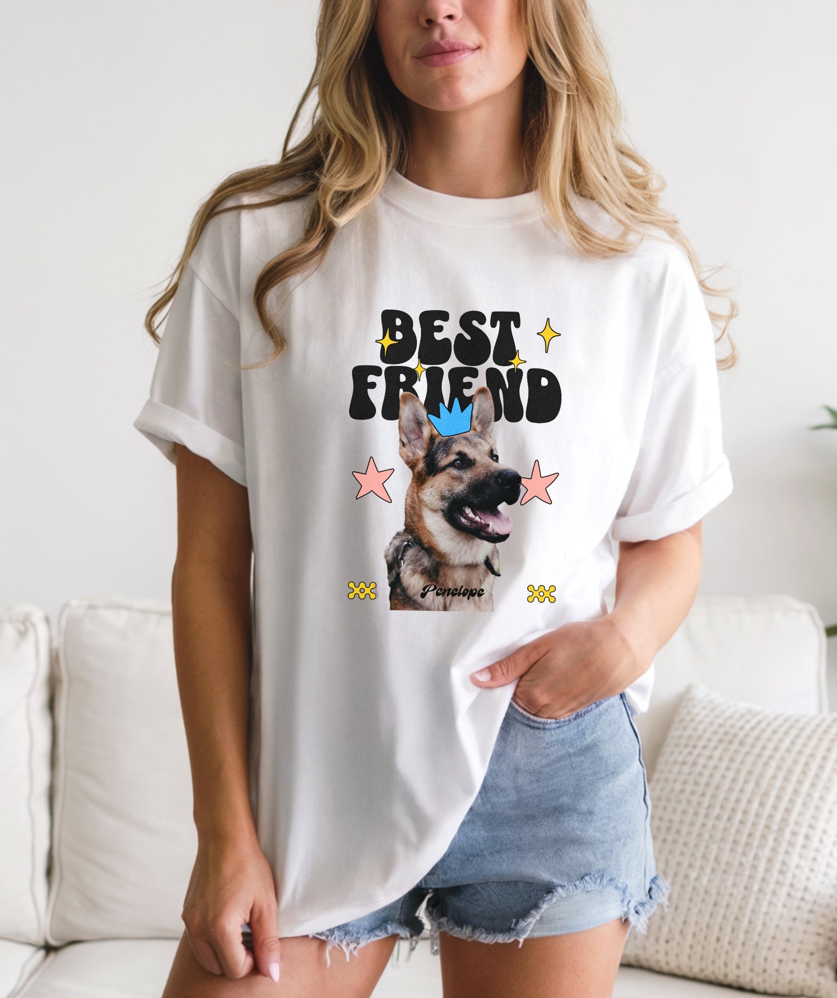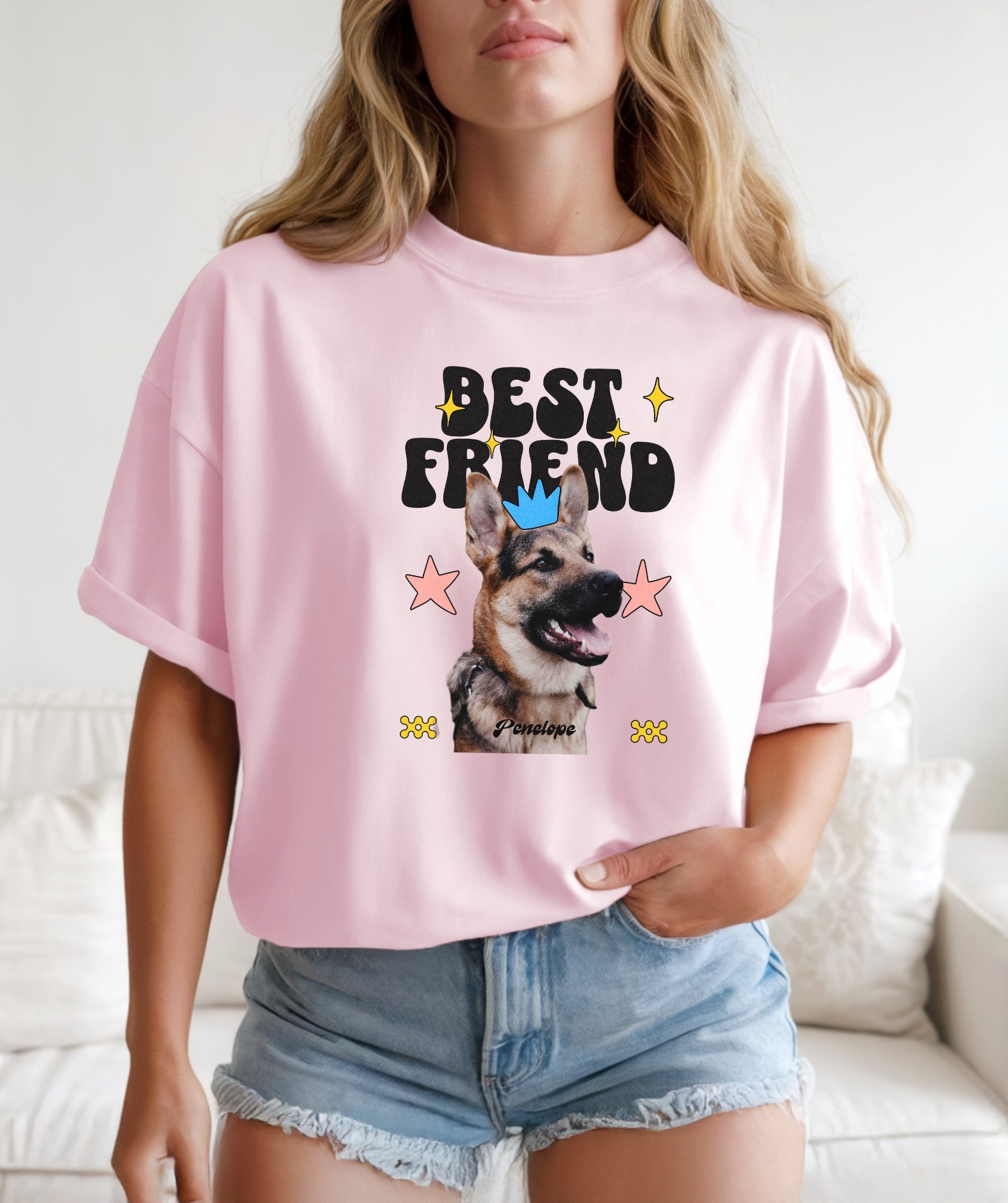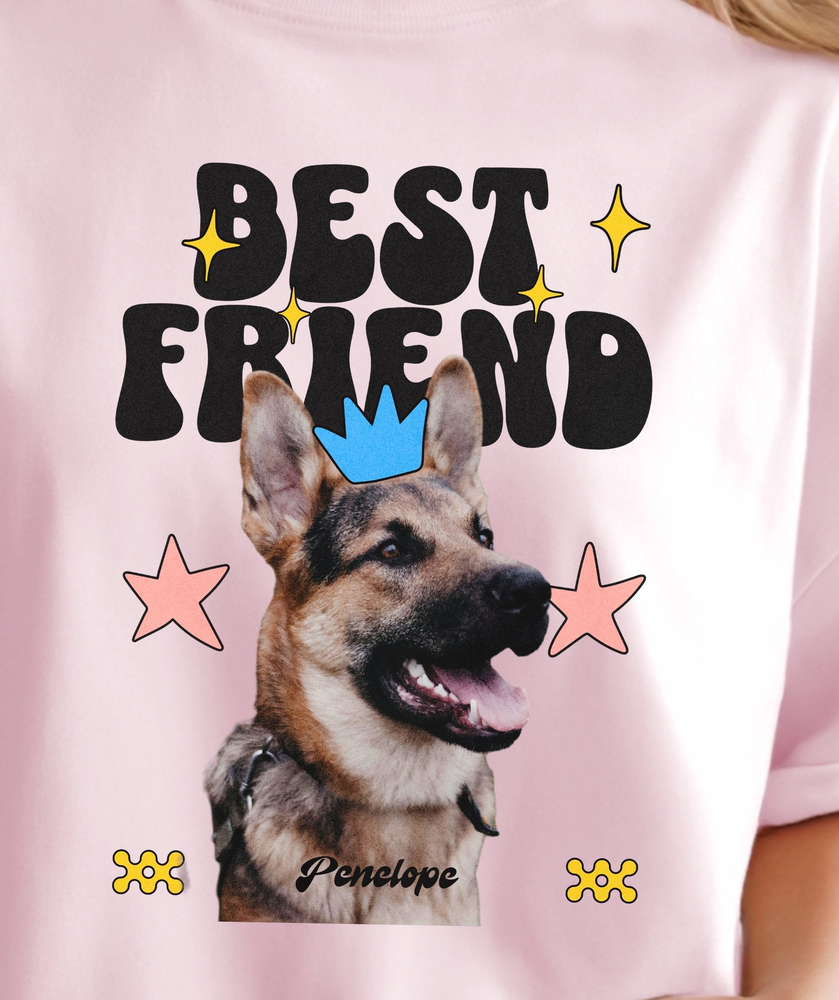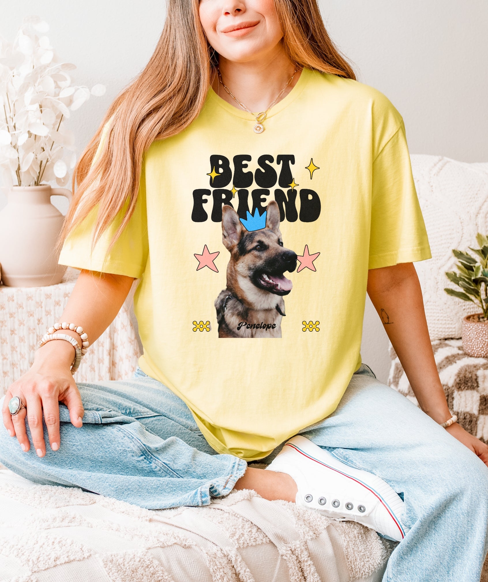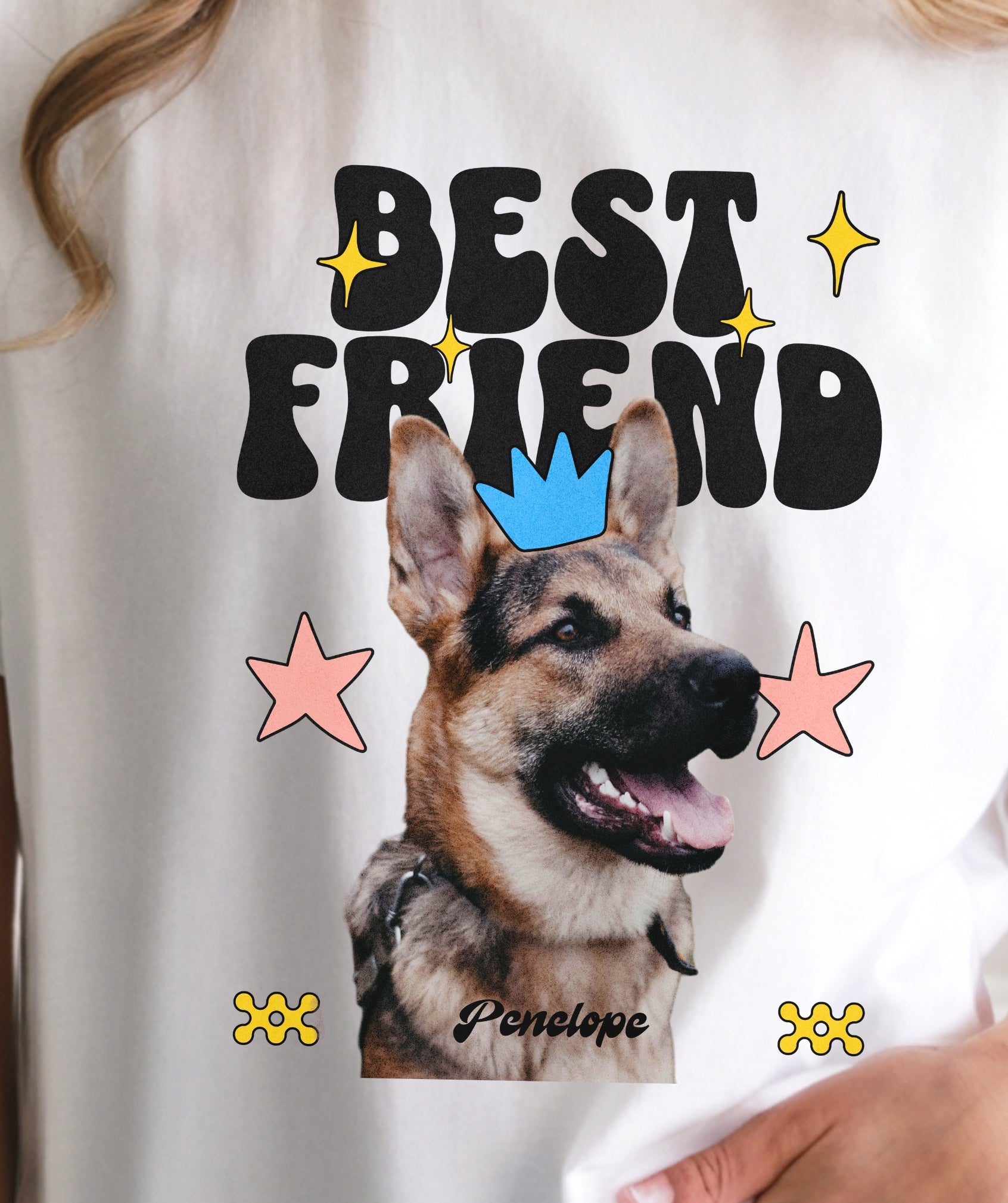 Your dog is your ride-or-die—and now your wardrobe knows it. This custom tee features your pup’s photo and name, decked out with groovy shapes, bright stars, and bold “Best Friend” lettering.