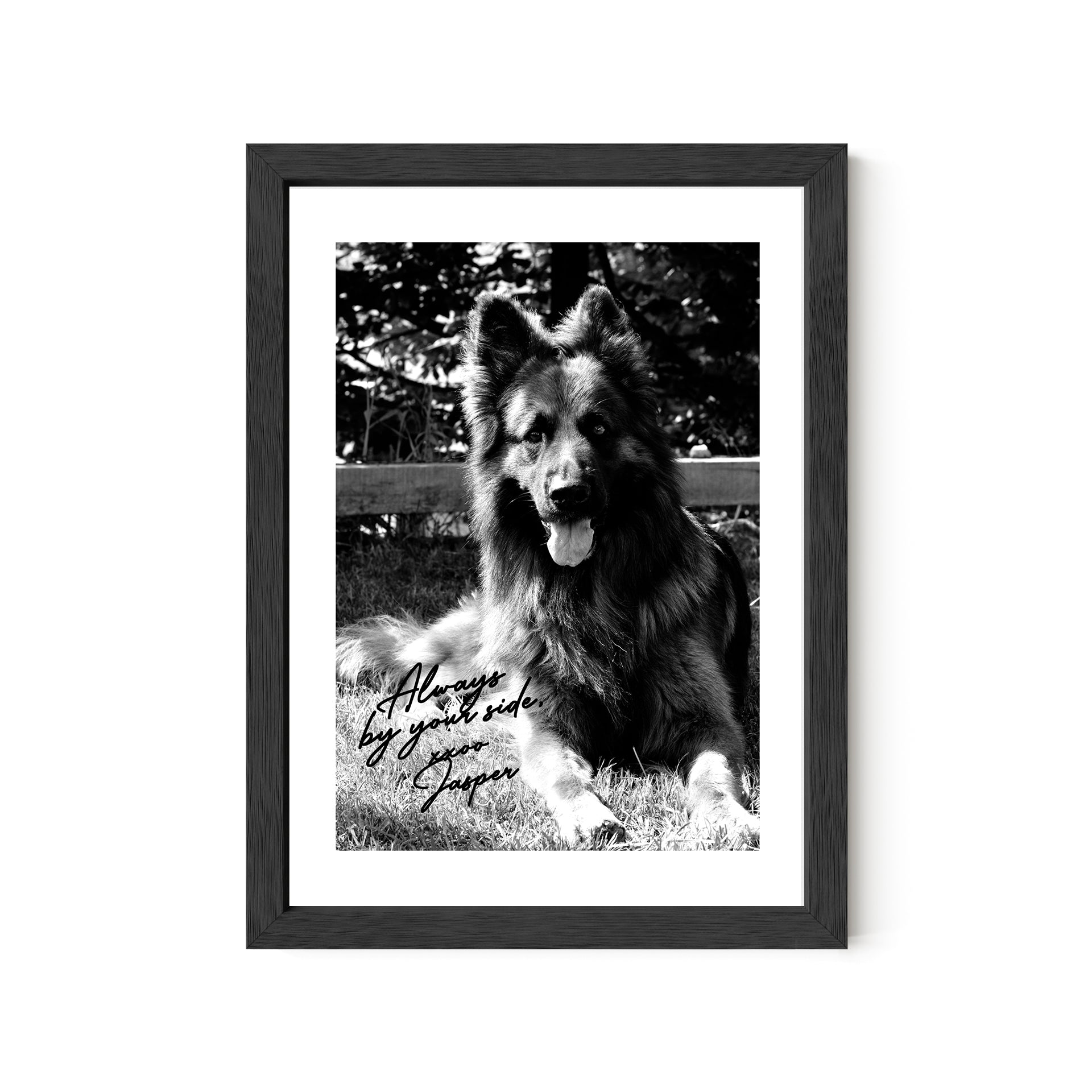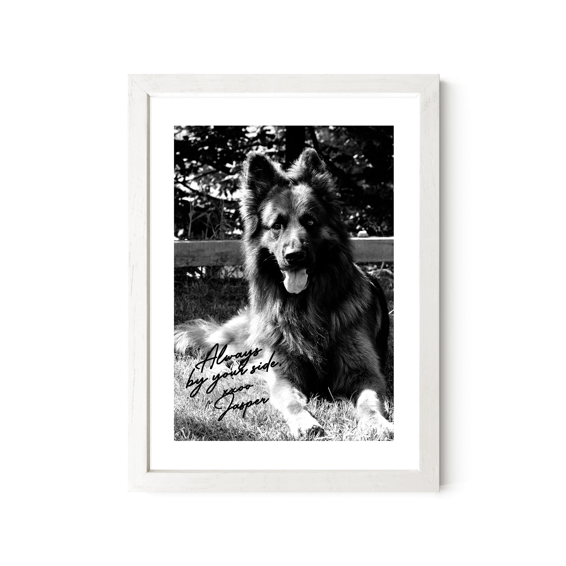 This 5x7 desktop portrait transforms your favorite German Shepherd photo into a timeless black-and-white tribute—with a choice of personalized autograph-style messages. It's a meaningful way to keep your best friend close at work, at home, or wherever you need a quiet reminder of loyalty and love.