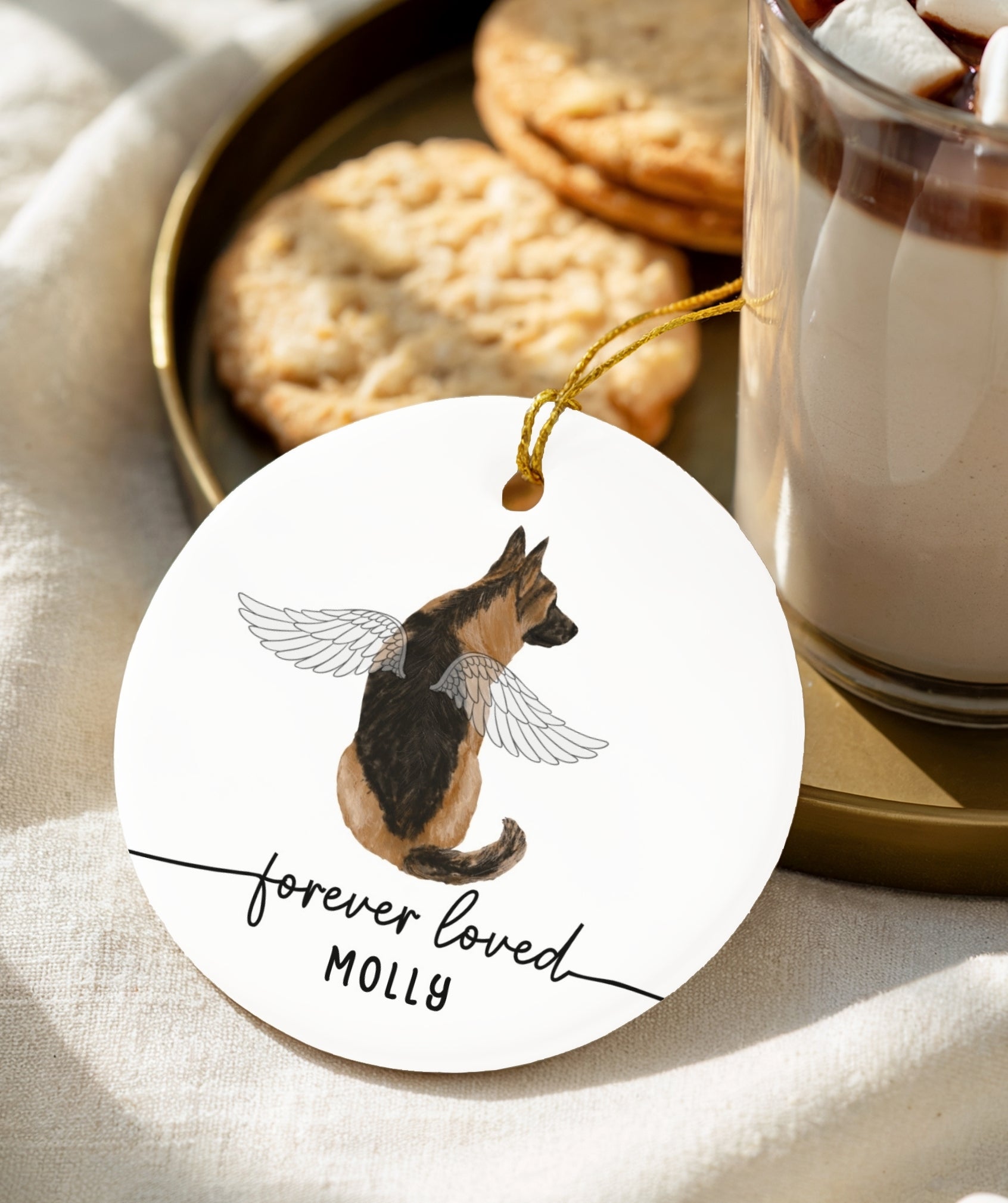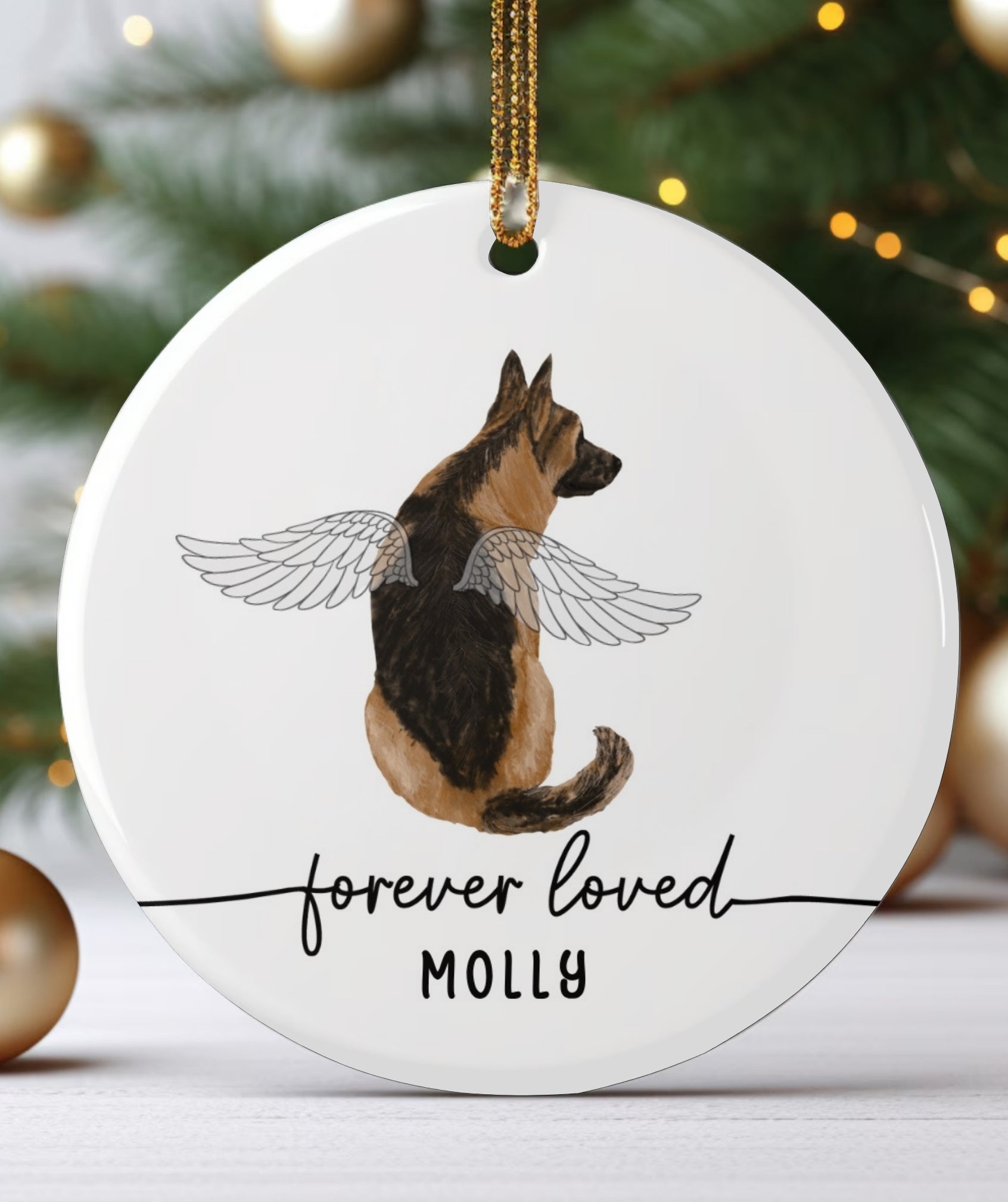 Honor your Shepherd’s memory with this peaceful angel wings ornament. A comforting tribute personalized with your dog’s name, it’s a gentle reminder of love that lasts forever.