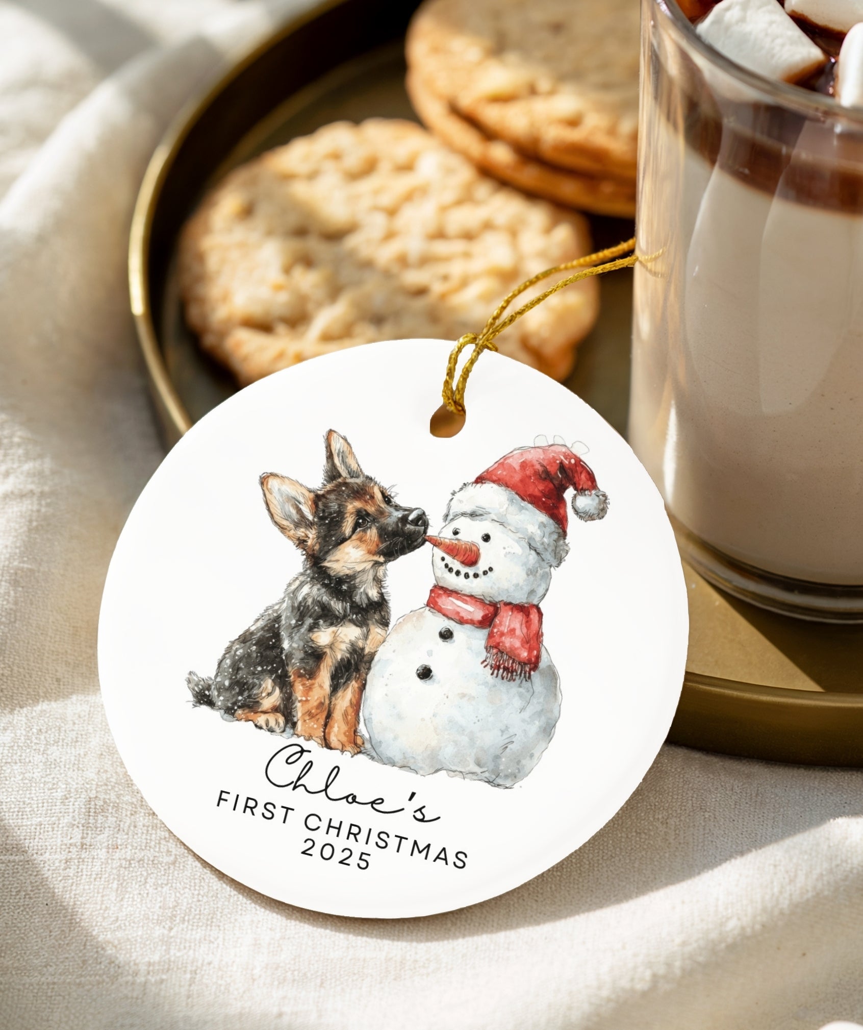 Capture your puppy’s first holiday with this adorable snowman ornament. Personalized with your Shepherd’s name and year, it’s a heartwarming keepsake for every new dog parent.