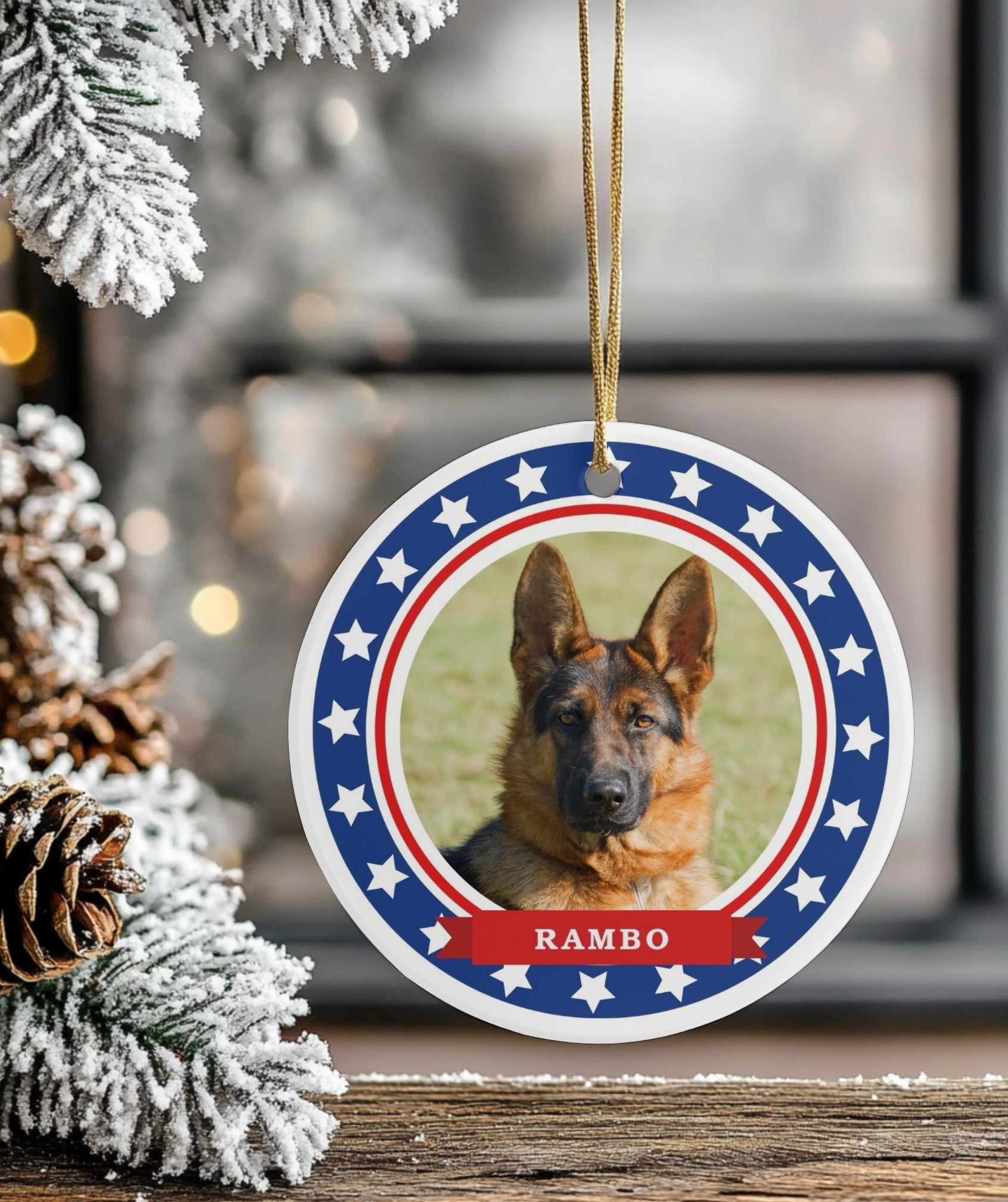 Celebrate your Shepherd’s courage and devotion with this patriotic ornament. Featuring your dog’s photo and name, it’s a bold tribute to loyalty, love, and the red, white, and blue.