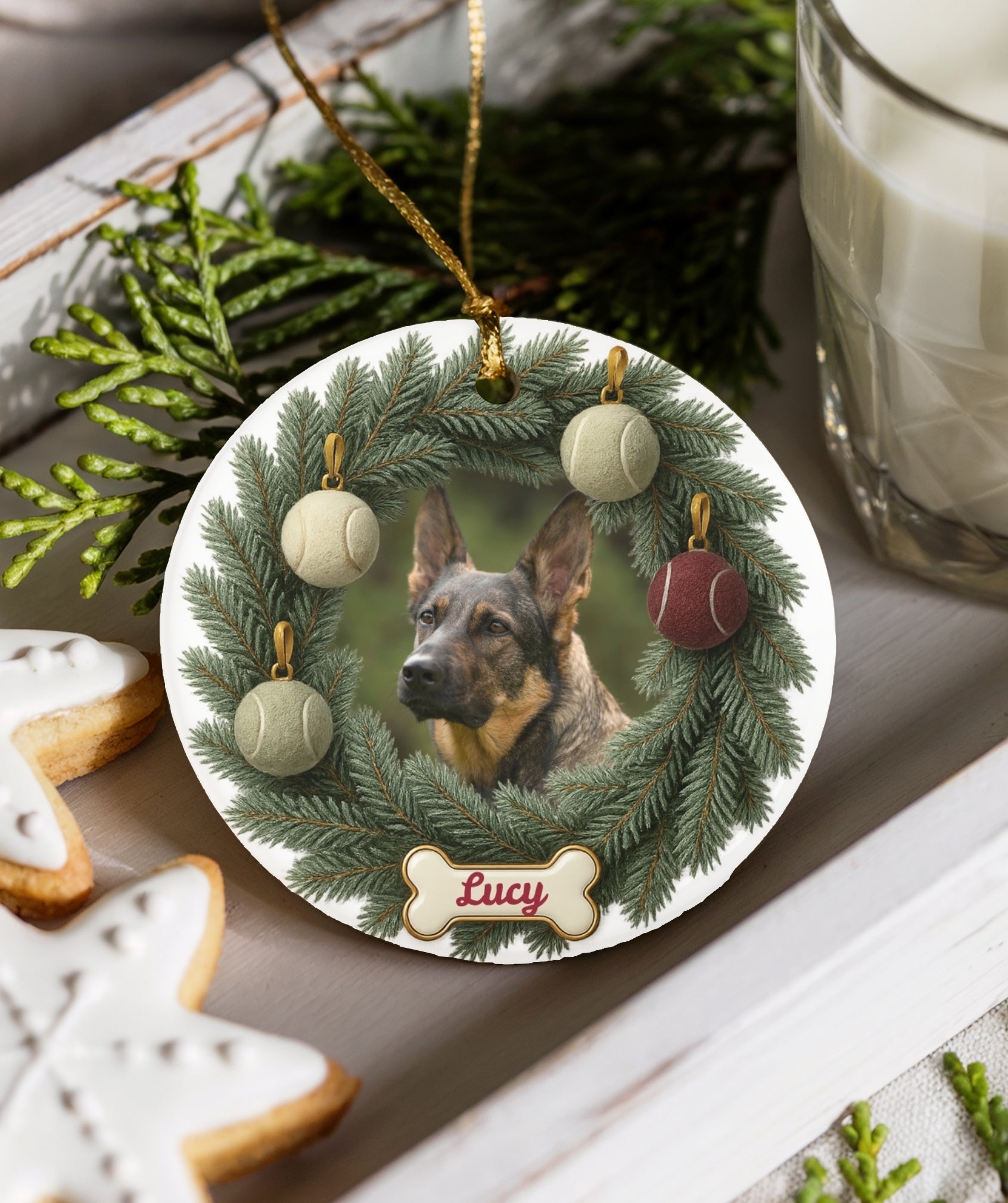 Celebrate your dog’s playful spirit with this custom wreath ornament. Decorated with tennis ball “baubles” and your Shepherd’s name and photo, it’s the perfect mix of fetch and festive.