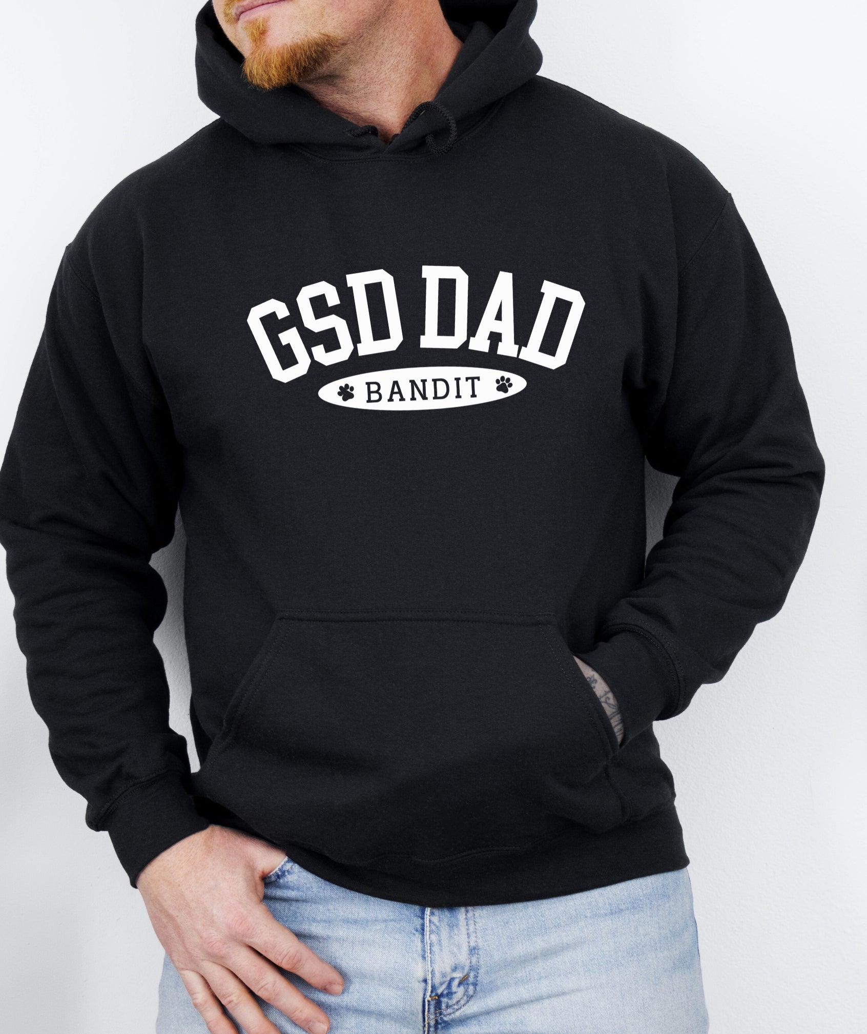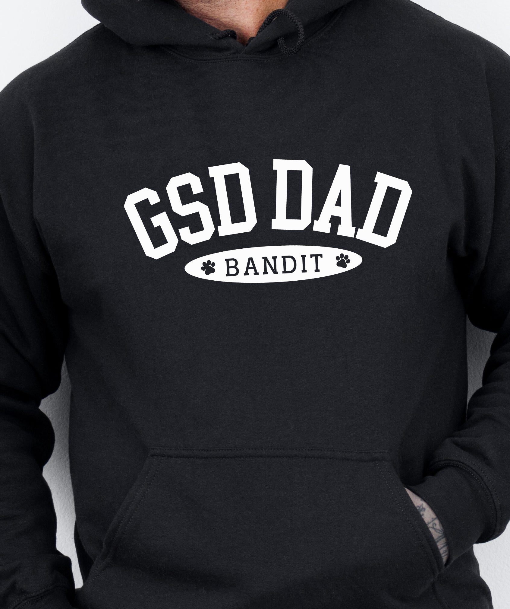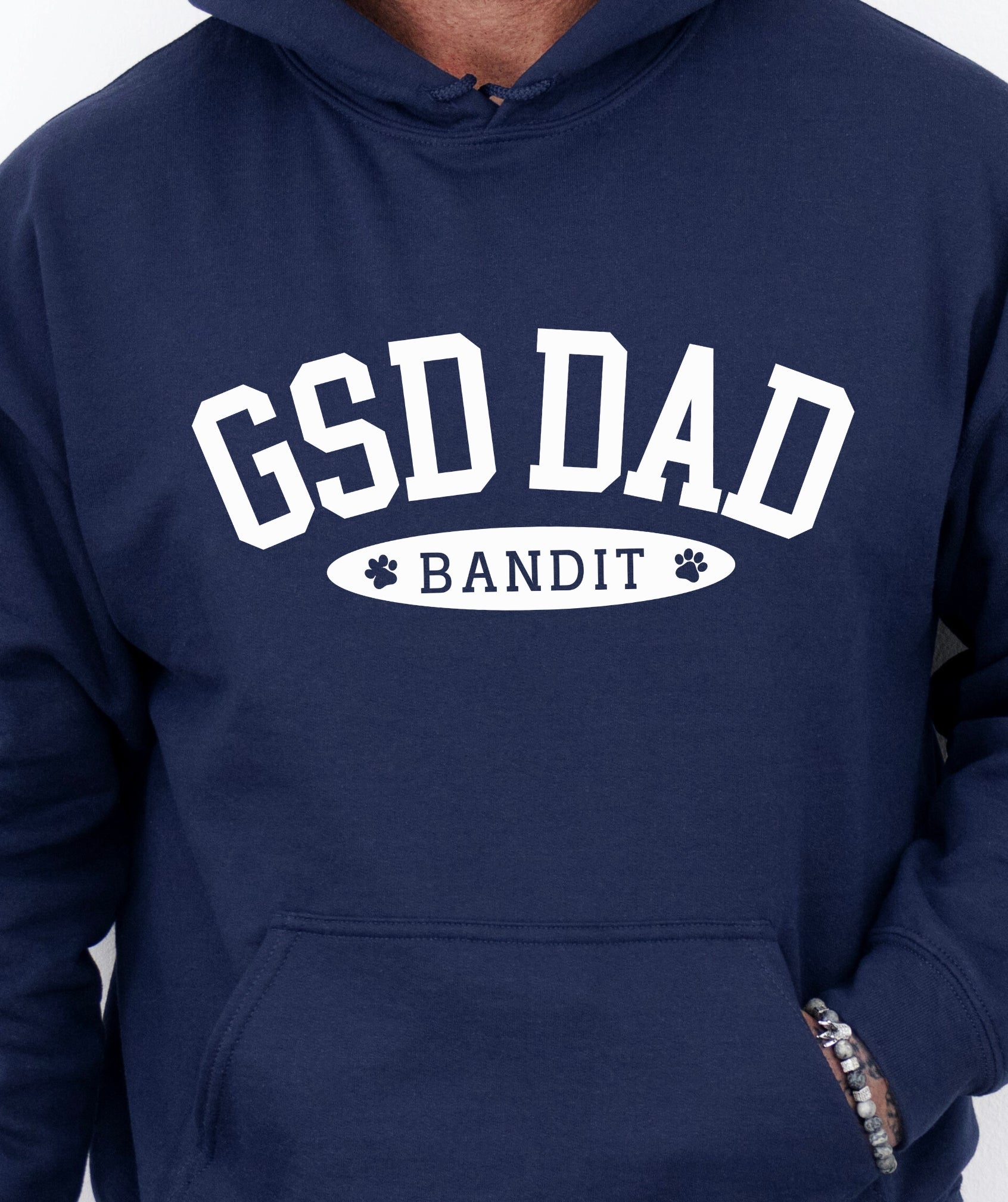 Rep your GSD pride like a true team captain. This varsity-style hoodie features bold collegiate lettering for “GSD DAD” and a custom nameplate underneath—complete with paw prints. It’s the perfect blend of tough and heartwarming, just like your bond.