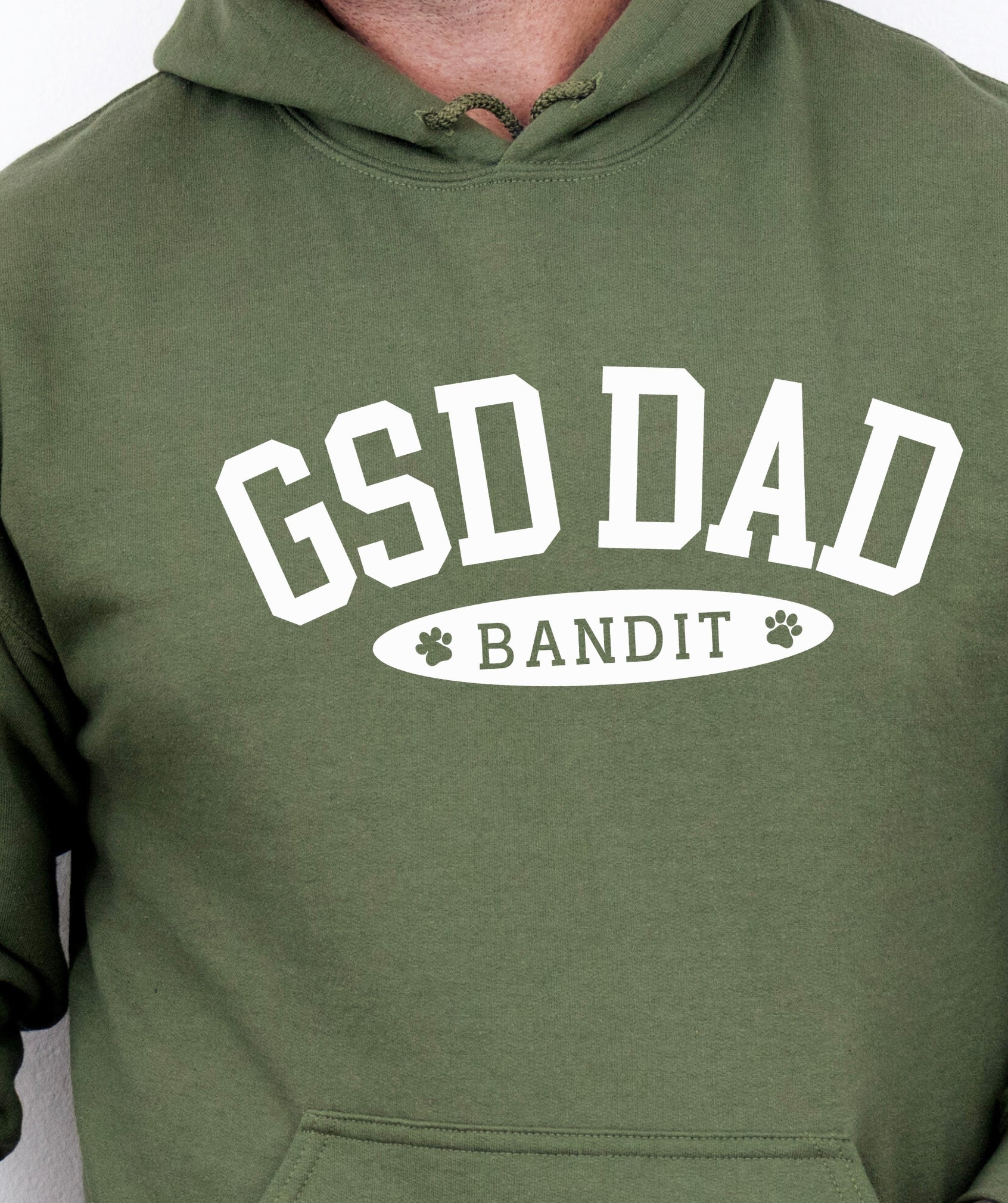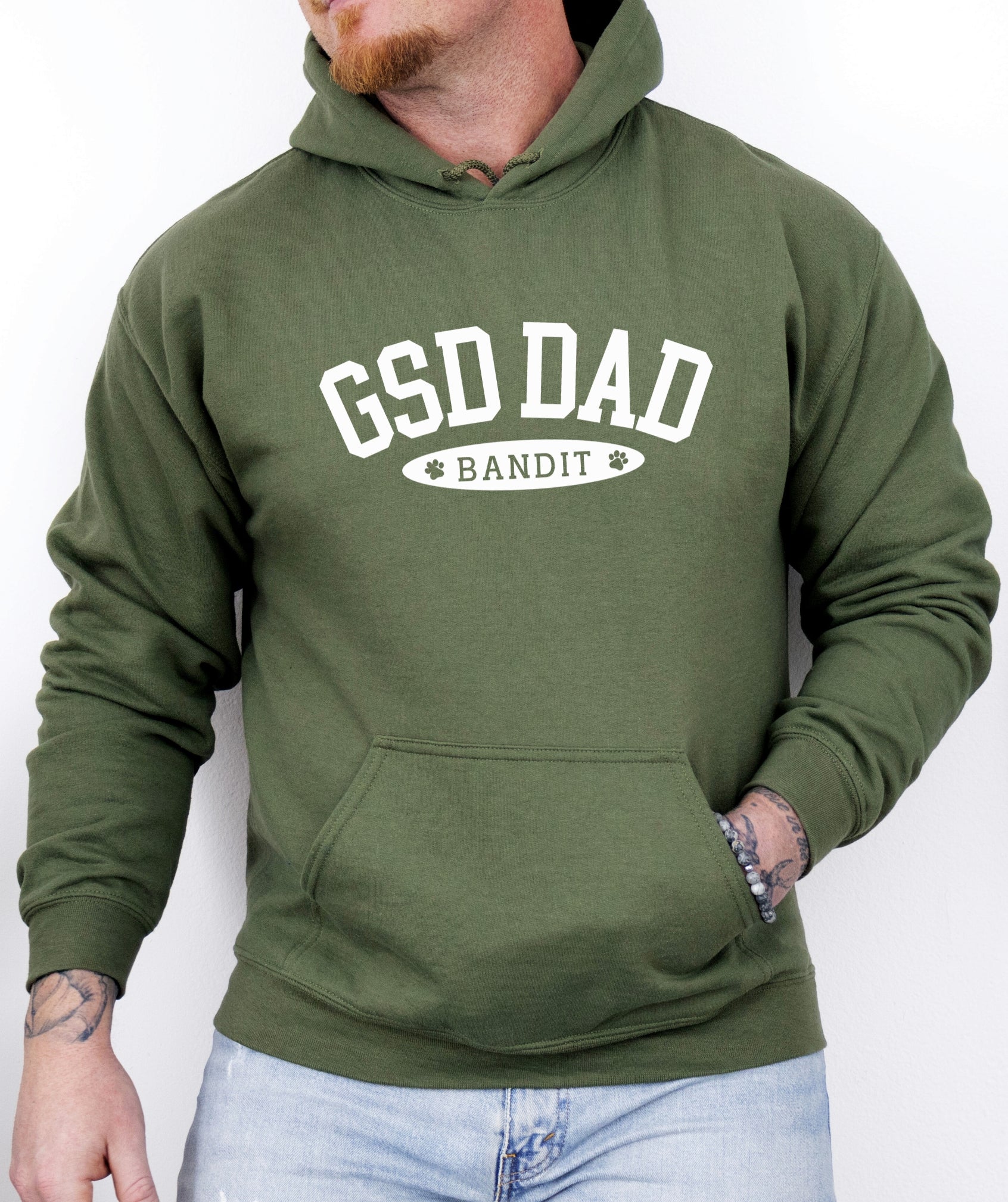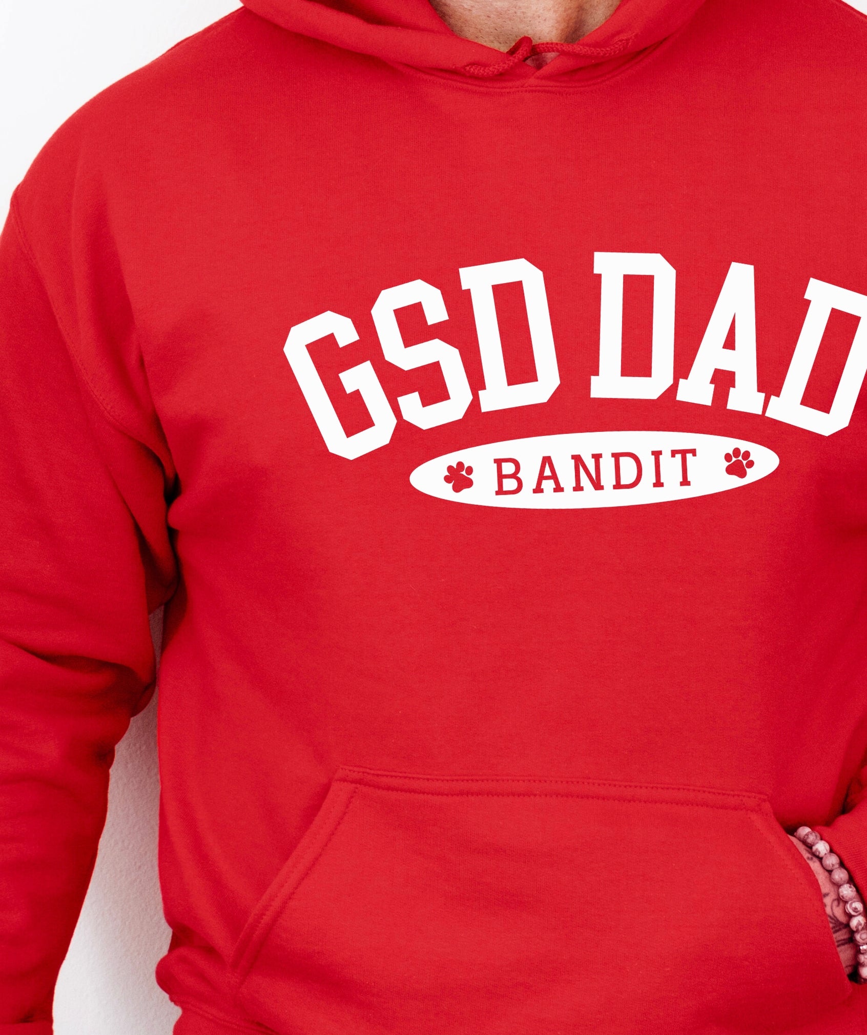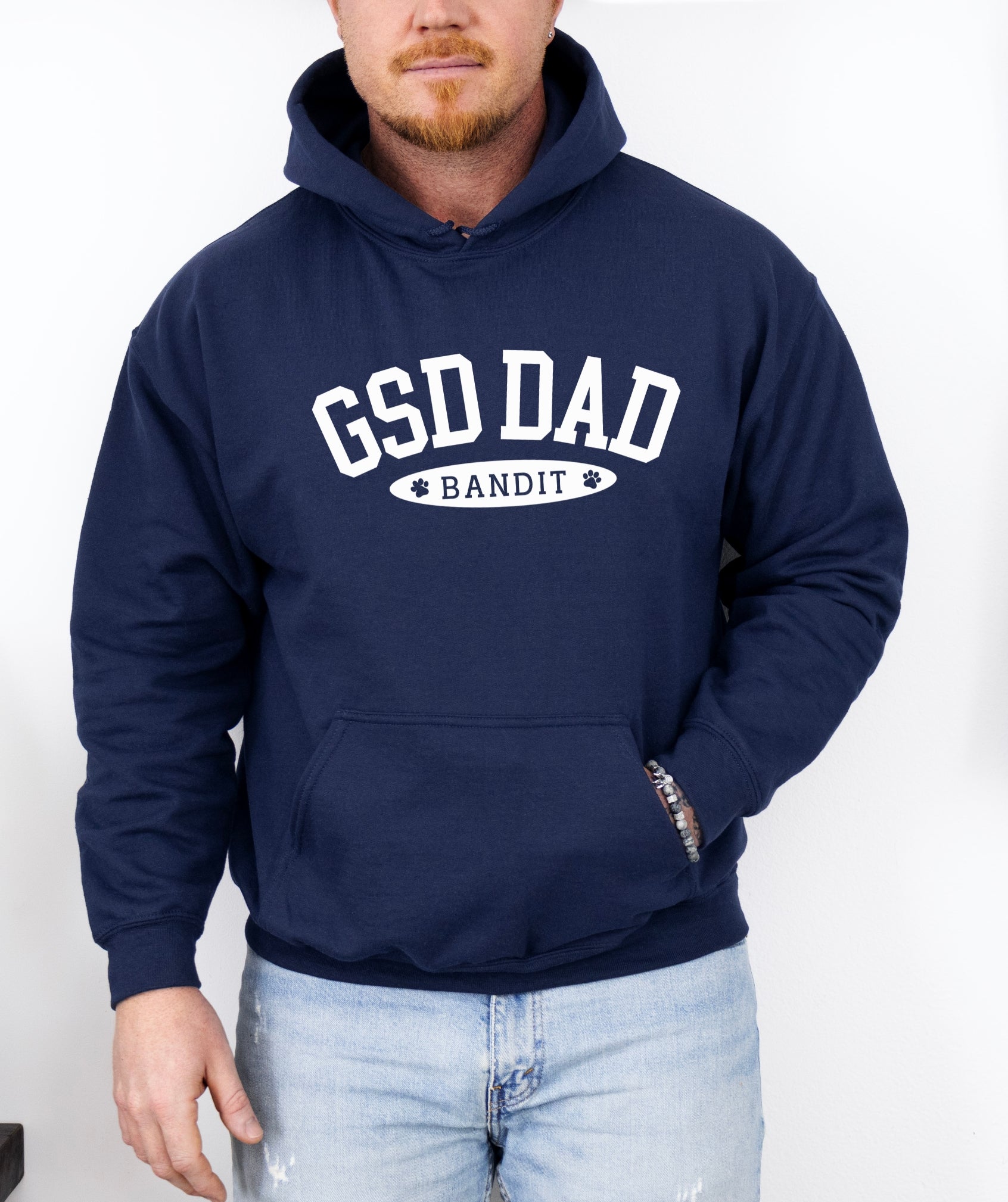 Rep your GSD pride like a true team captain. This varsity-style hoodie features bold collegiate lettering for “GSD DAD” and a custom nameplate underneath—complete with paw prints. It’s the perfect blend of tough and heartwarming, just like your bond.