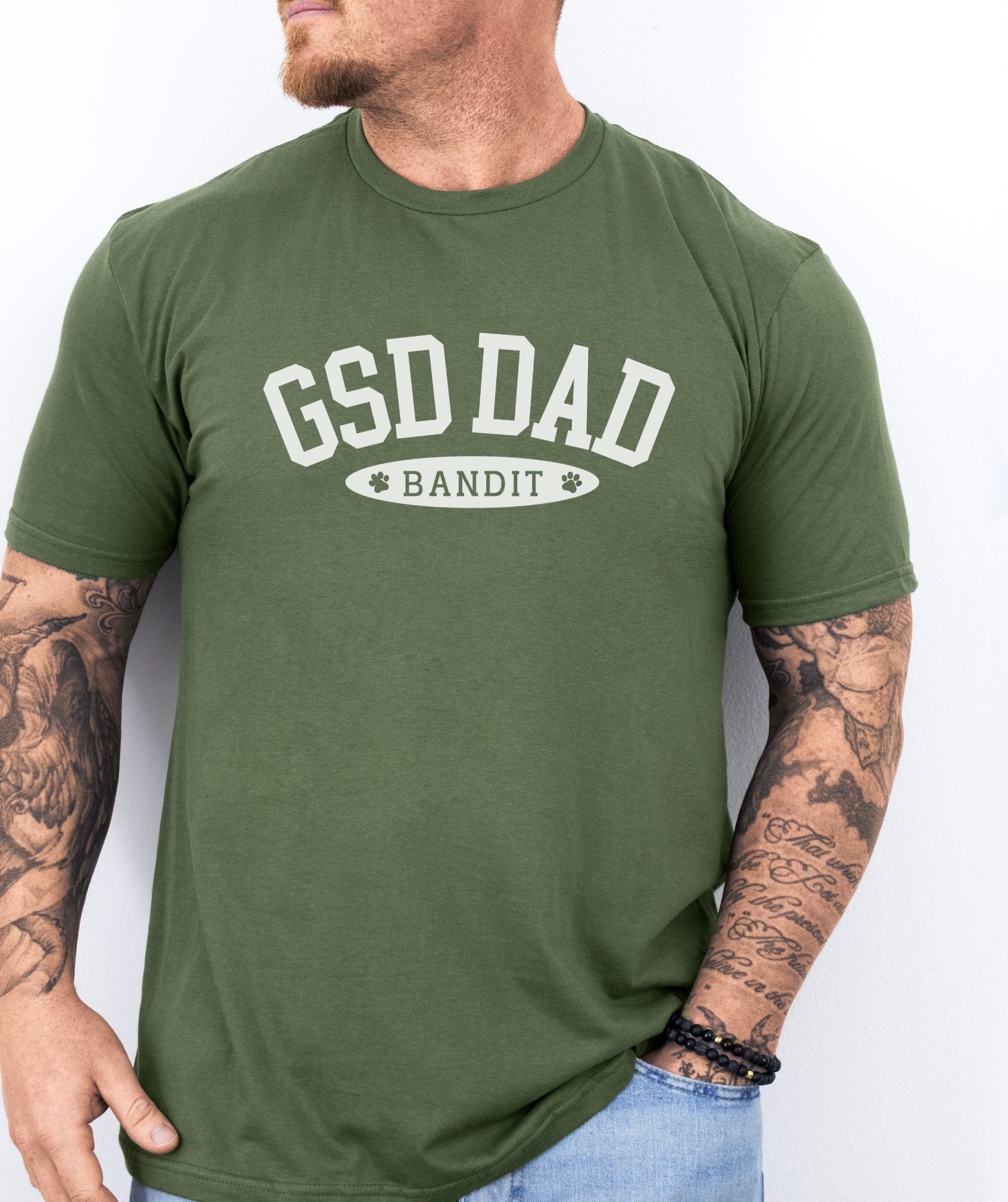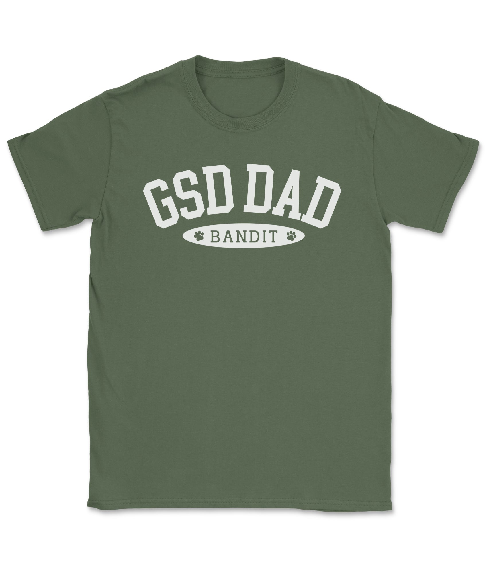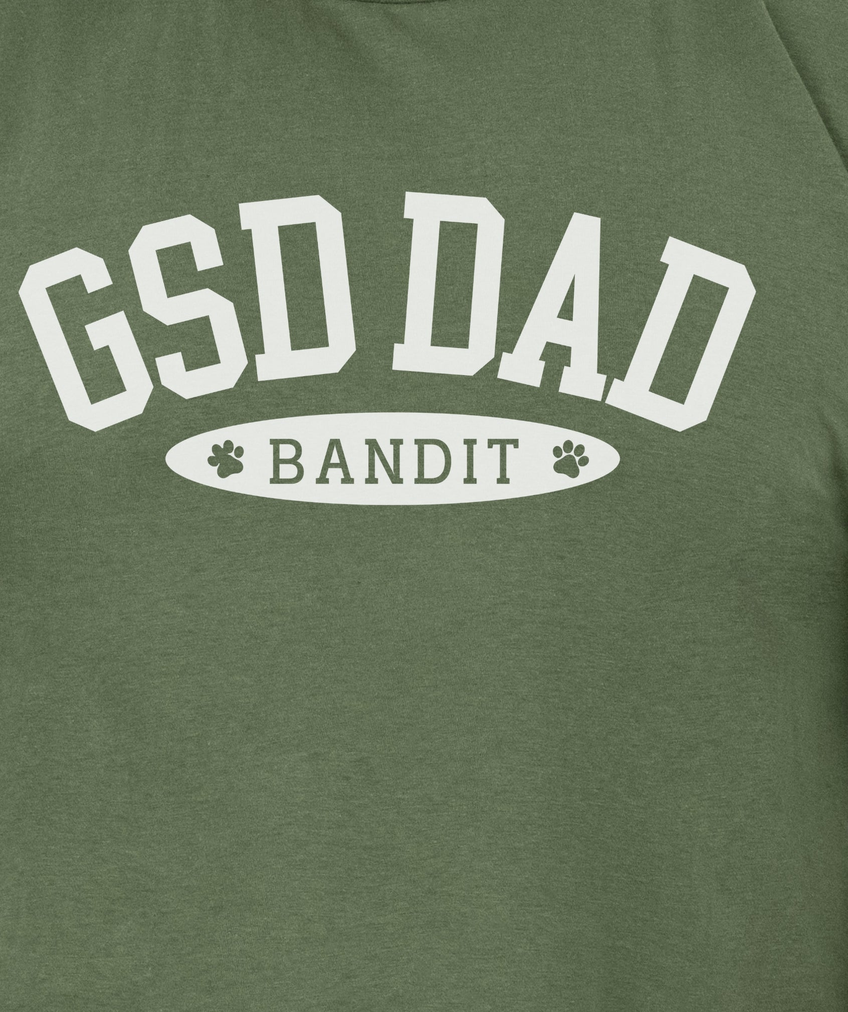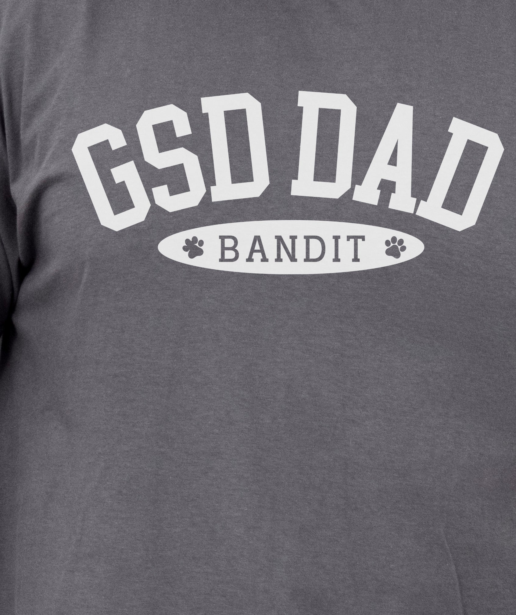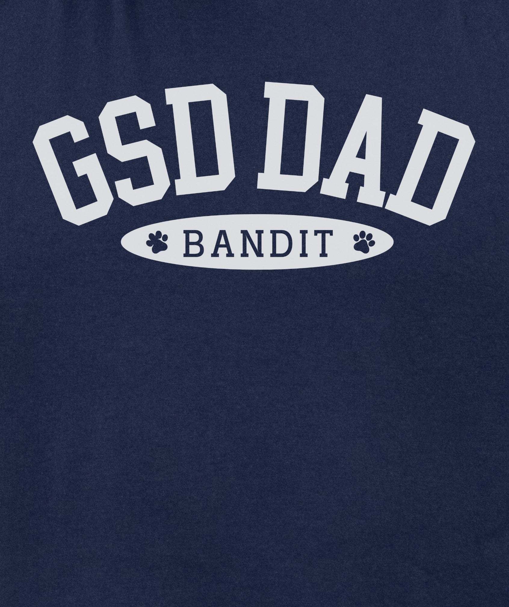 Rep your GSD pride like a true team captain. This varsity-style tee features bold collegiate lettering for "GSD DAD" and a custom nameplate underneath—complete with paw prints. It's the perfect blend of tough and heartwarming, just like your bond.
