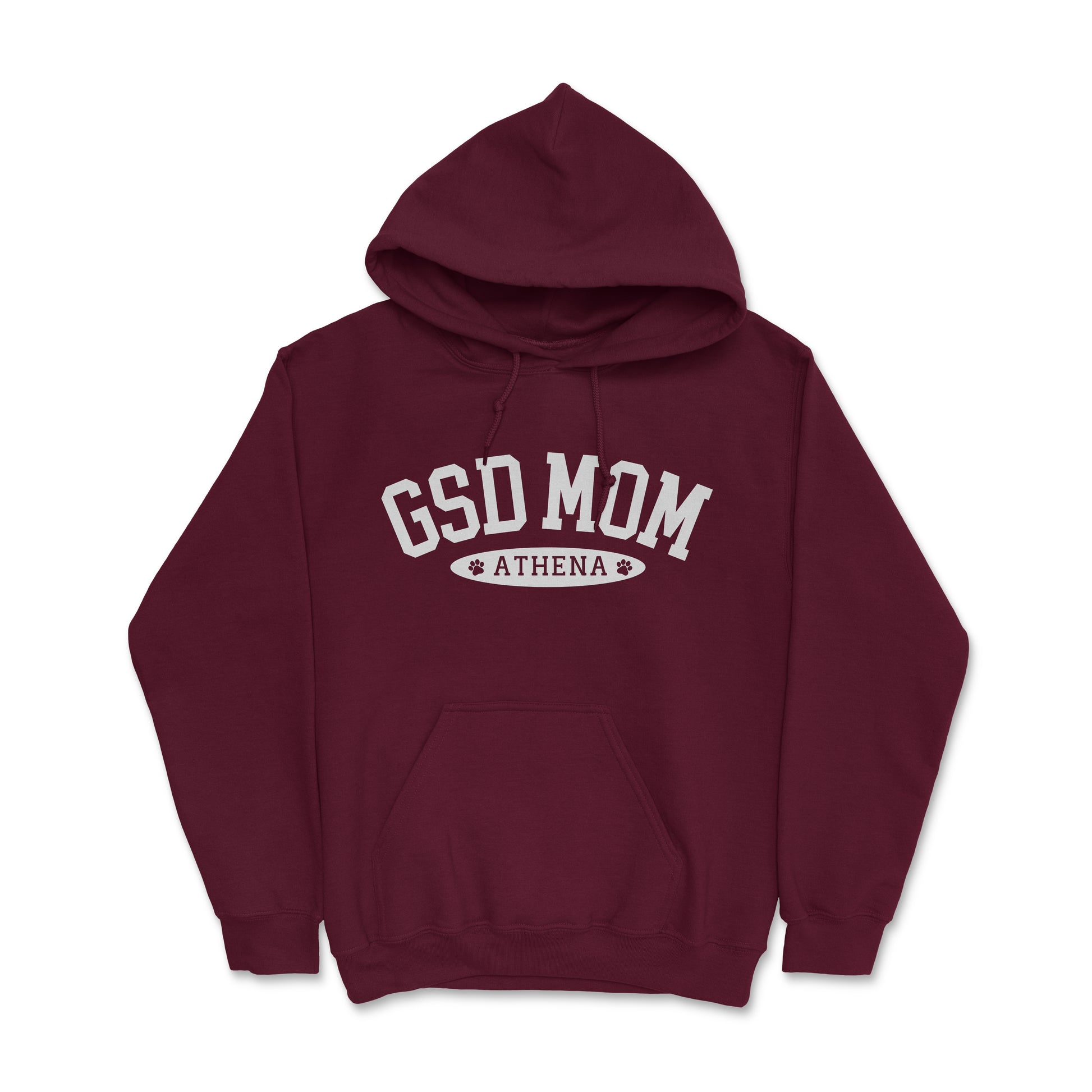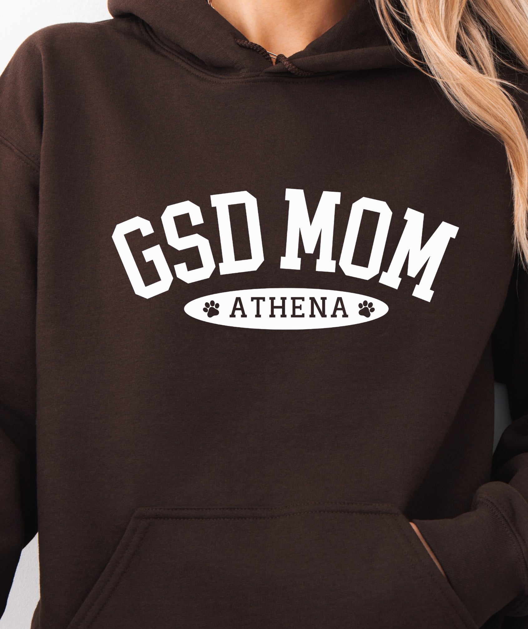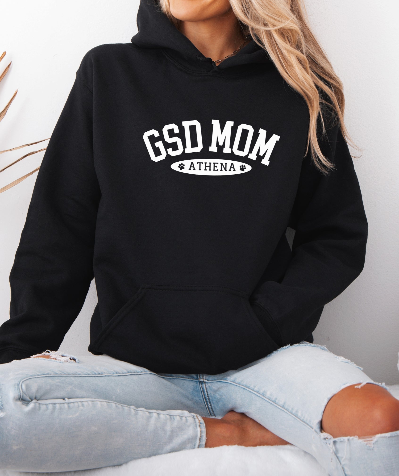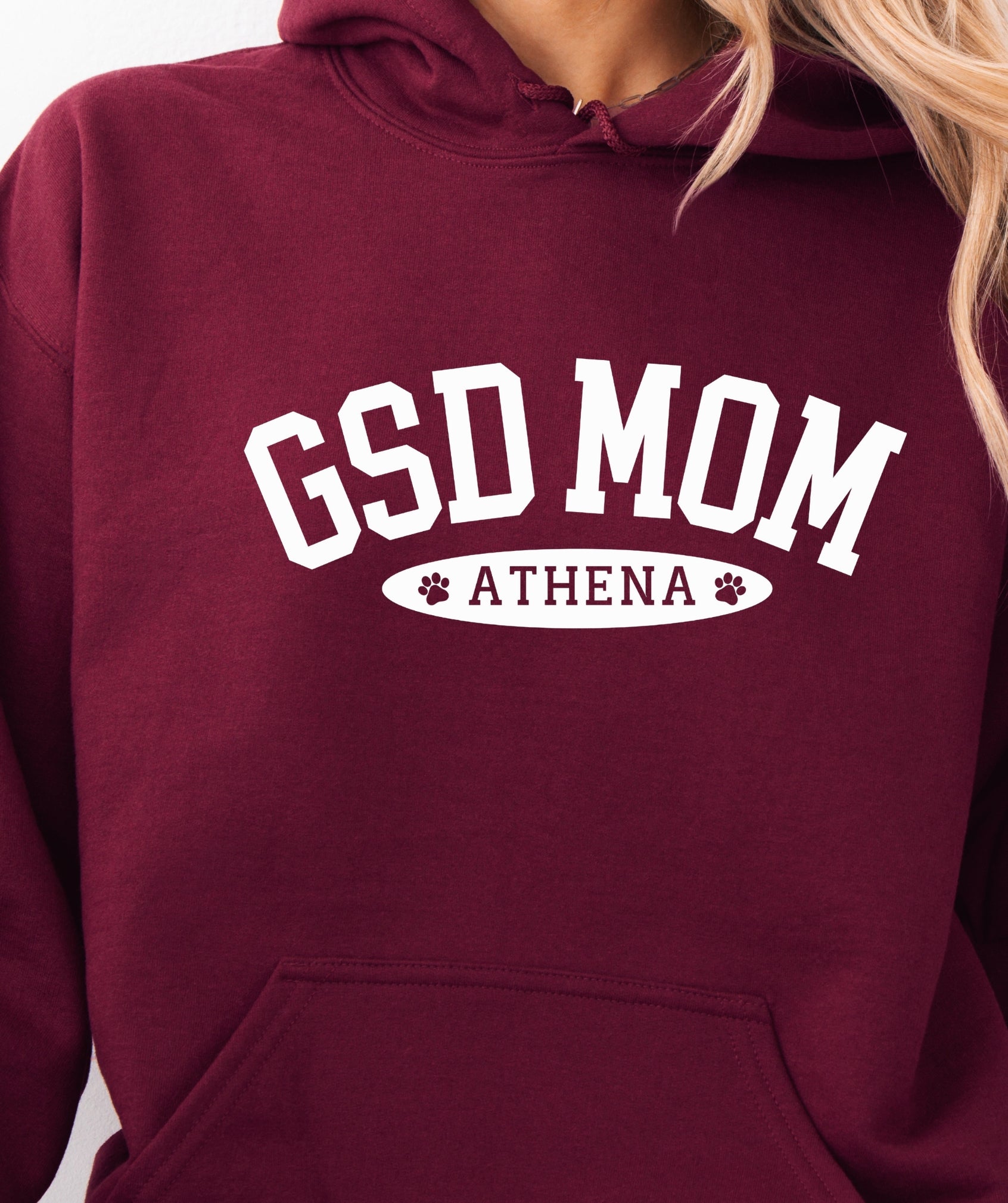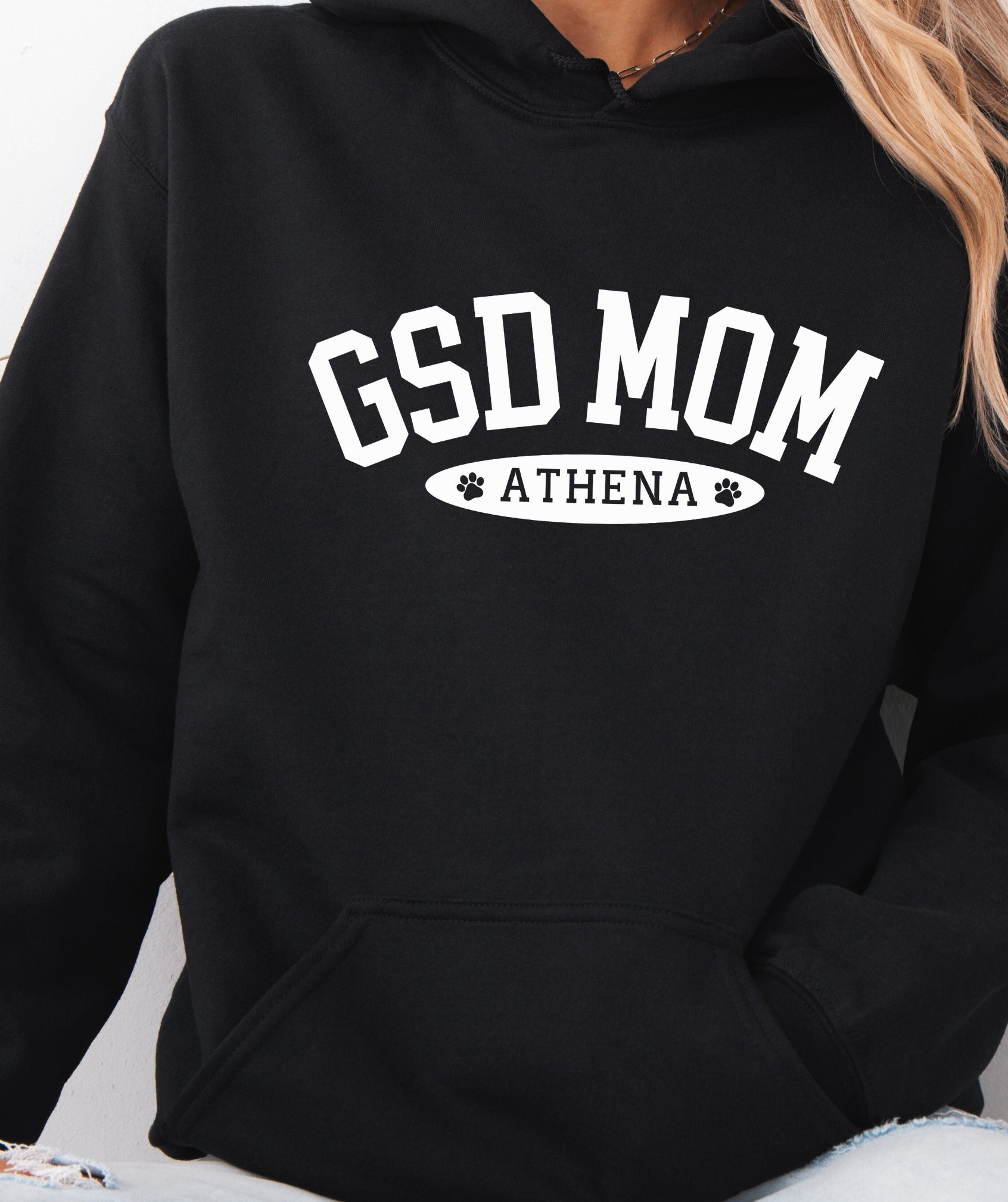 Show your team spirit—GSD style. This varsity-inspired hoodie proudly displays “GSD MOM” in bold collegiate lettering, with your dog’s name featured below in a sporty oval frame, flanked by paw prints. A must-have for every proud German Shepherd mama.