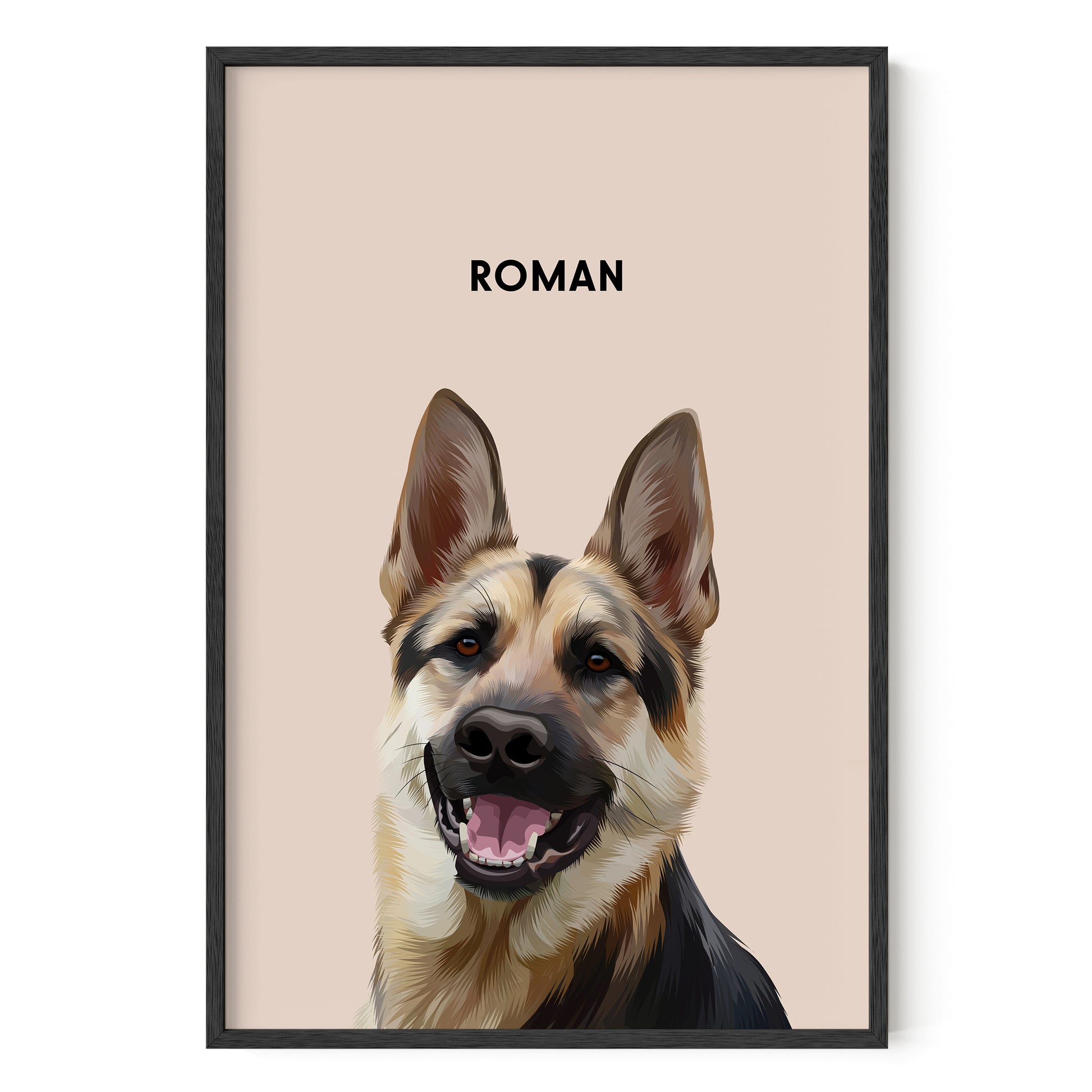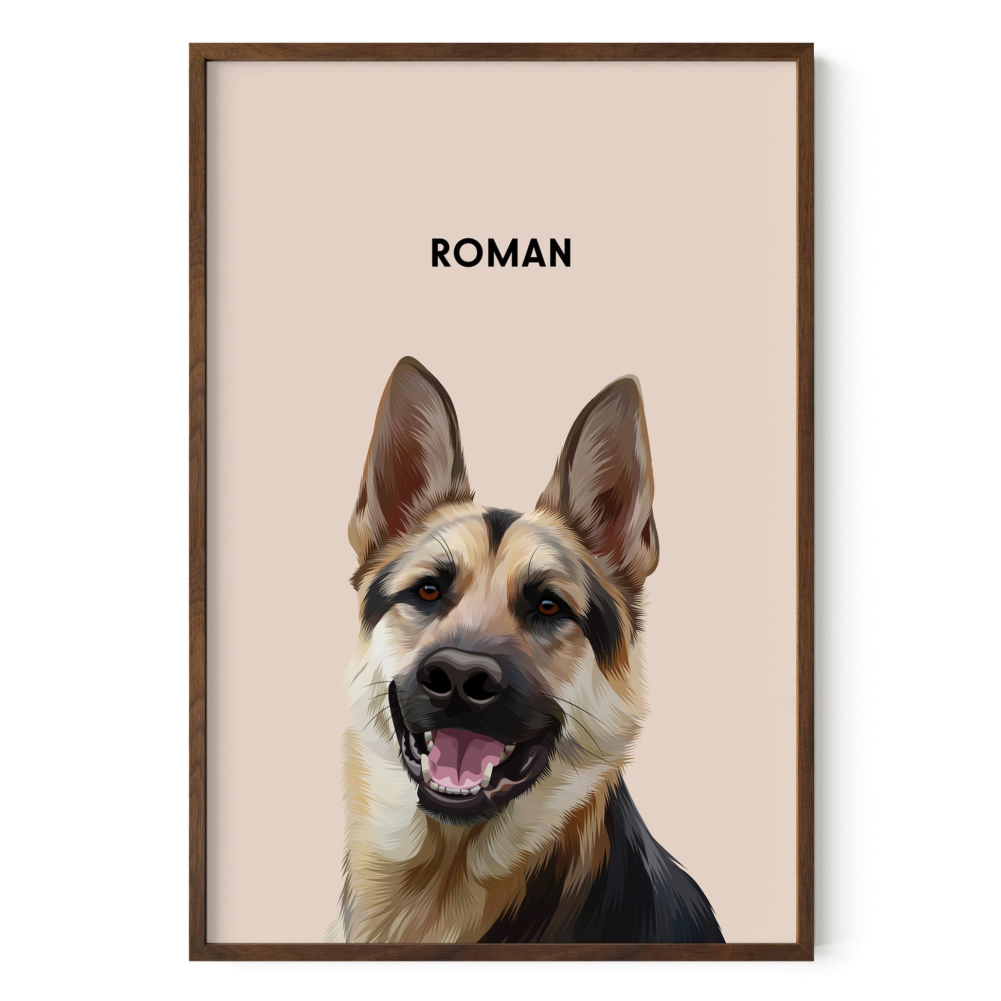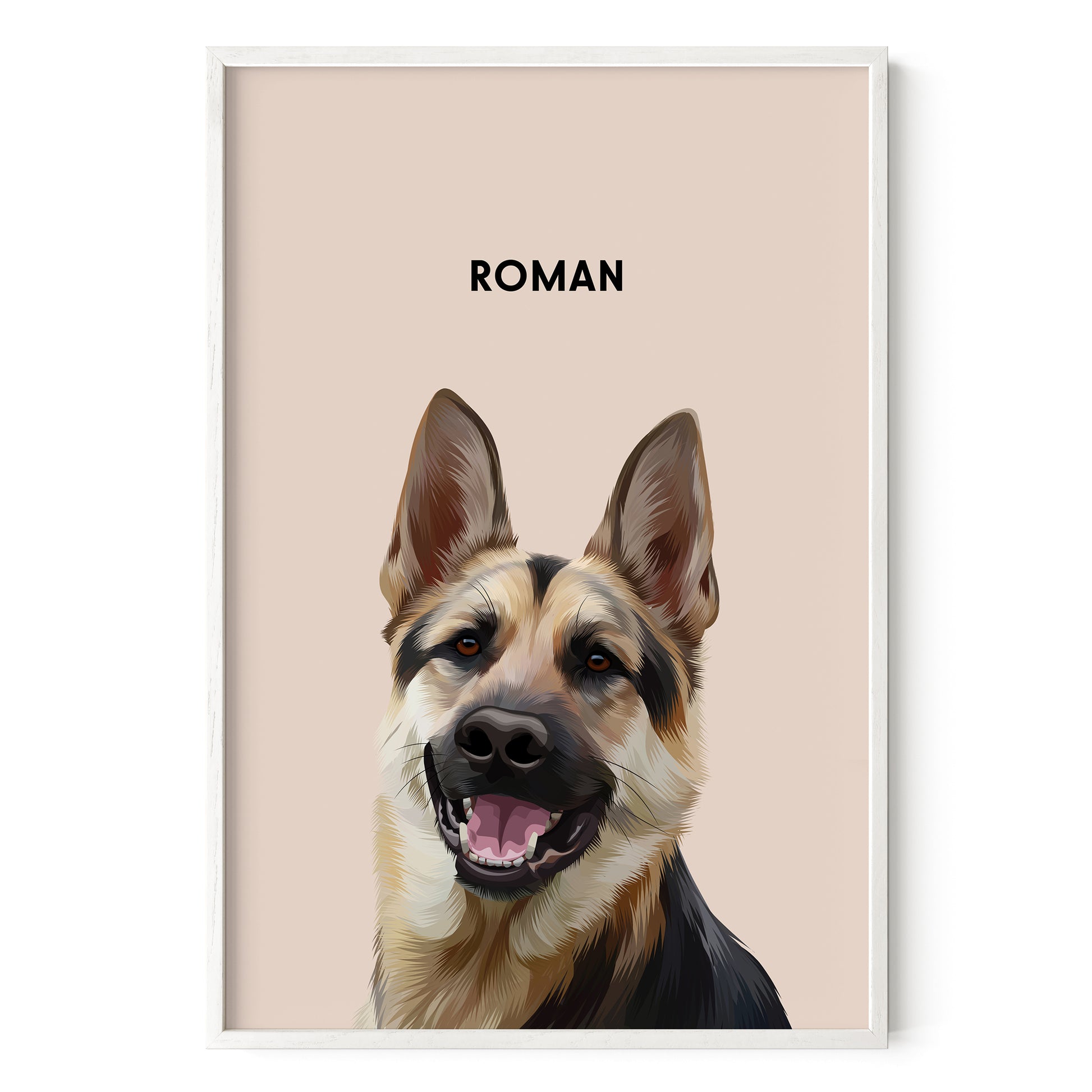 Bring your German Shepherd’s best look to life with bold simplicity. This custom portrait blends clean illustration style with crisp detail and a soft dusty pink background that adds warmth and charm. Whether it’s a serious stare or joyful grin, we use your photo to create a minimalist masterpiece made to suit your space and your Shepherd.