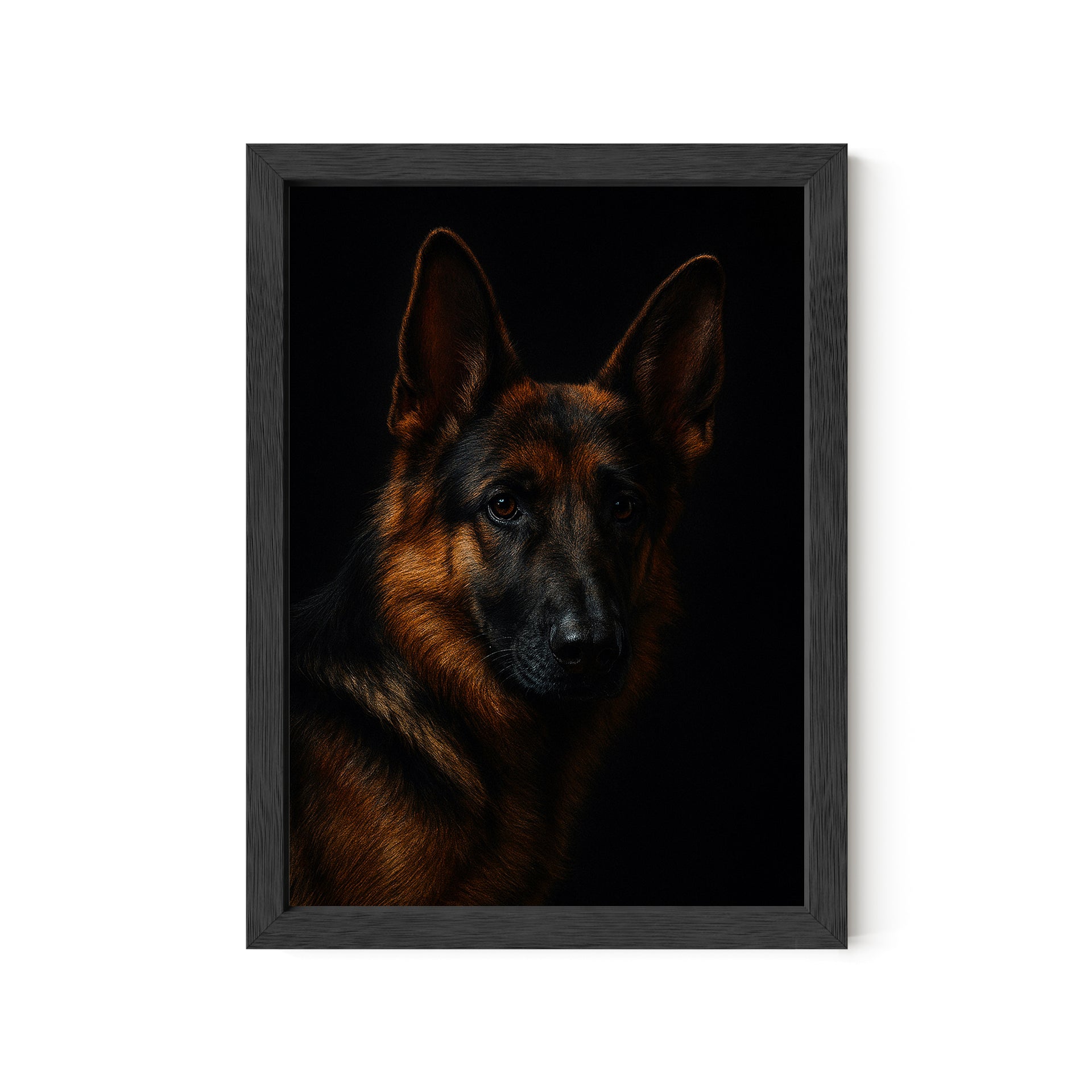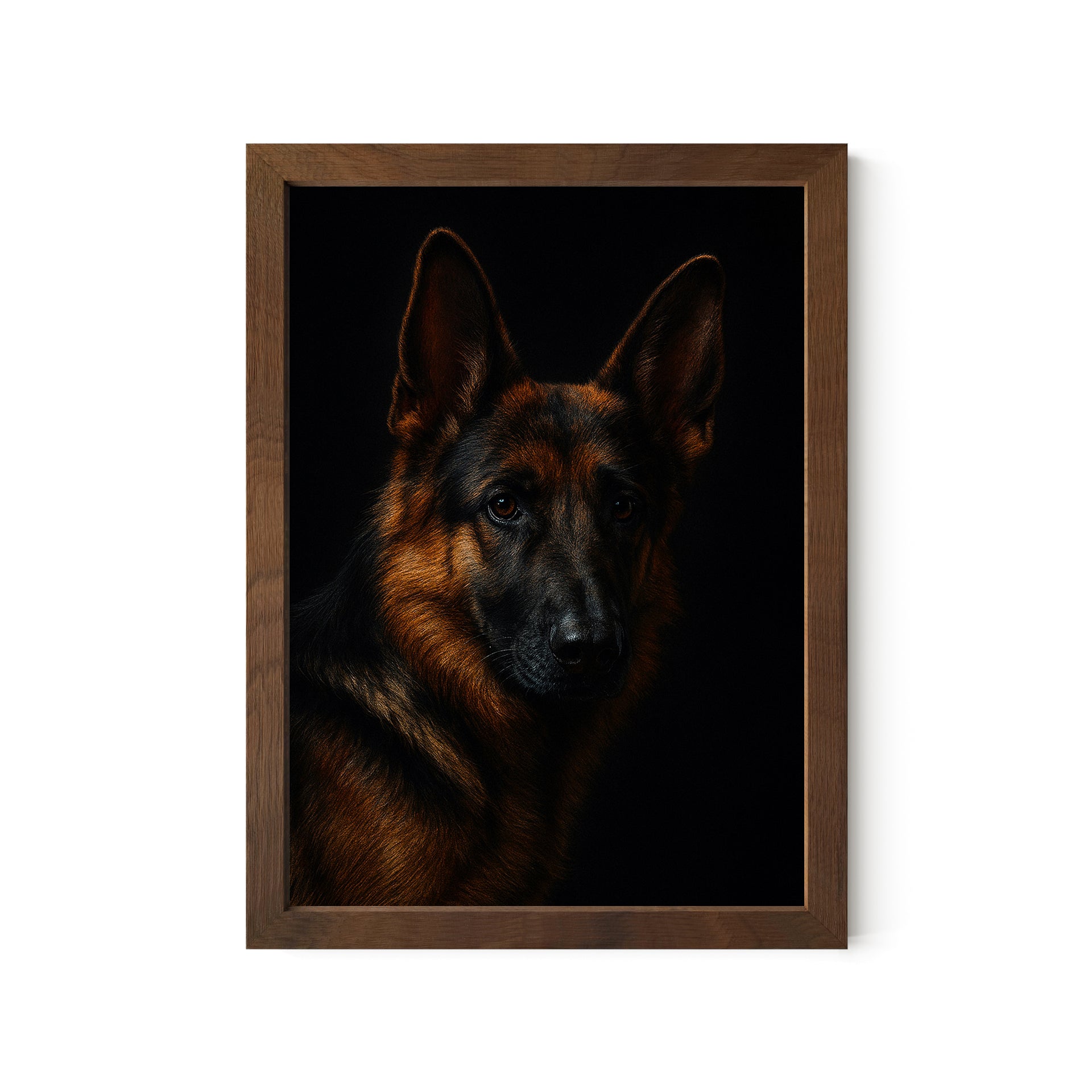 The Masterpiece desktop edition captures your German Shepherd’s strength and soul in a rich, painterly style. With deep shadows, soft lighting, and timeless expression, this 5x7 portrait brings quiet elegance to your shelf or workspace—no wall required, just presence.