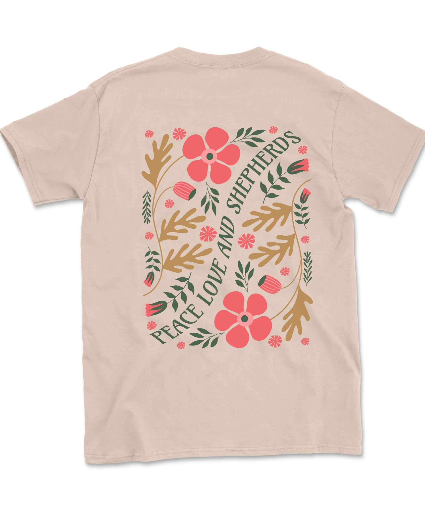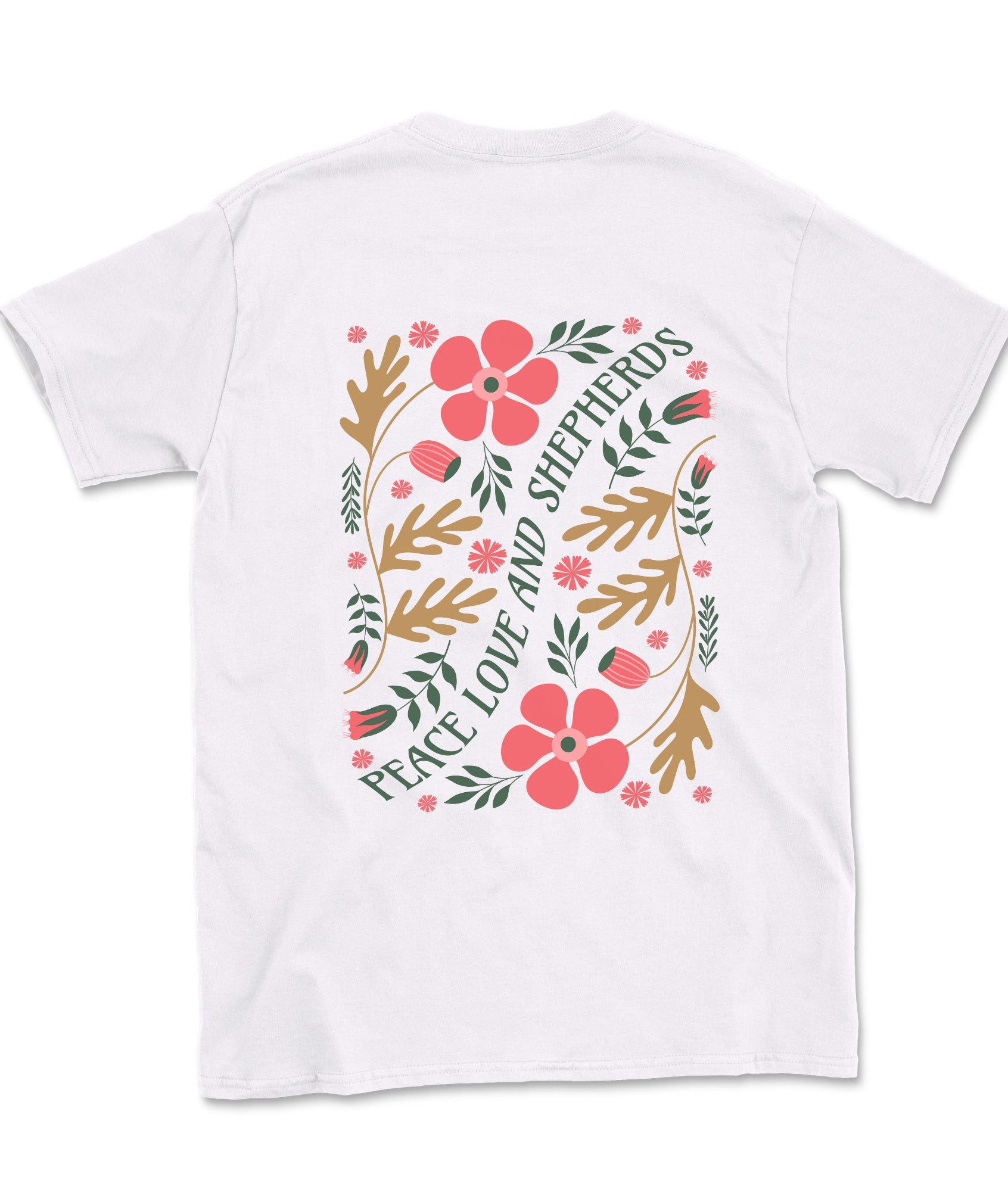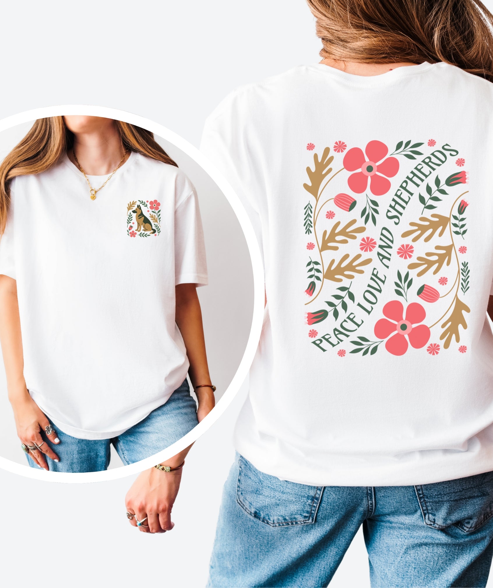 Spread good vibes with this Peace Love and Shepherds tee, featuring a sweet GSD and floral motif on the front and a full vibrant back design. Perfect for dog lovers with a boho heart.