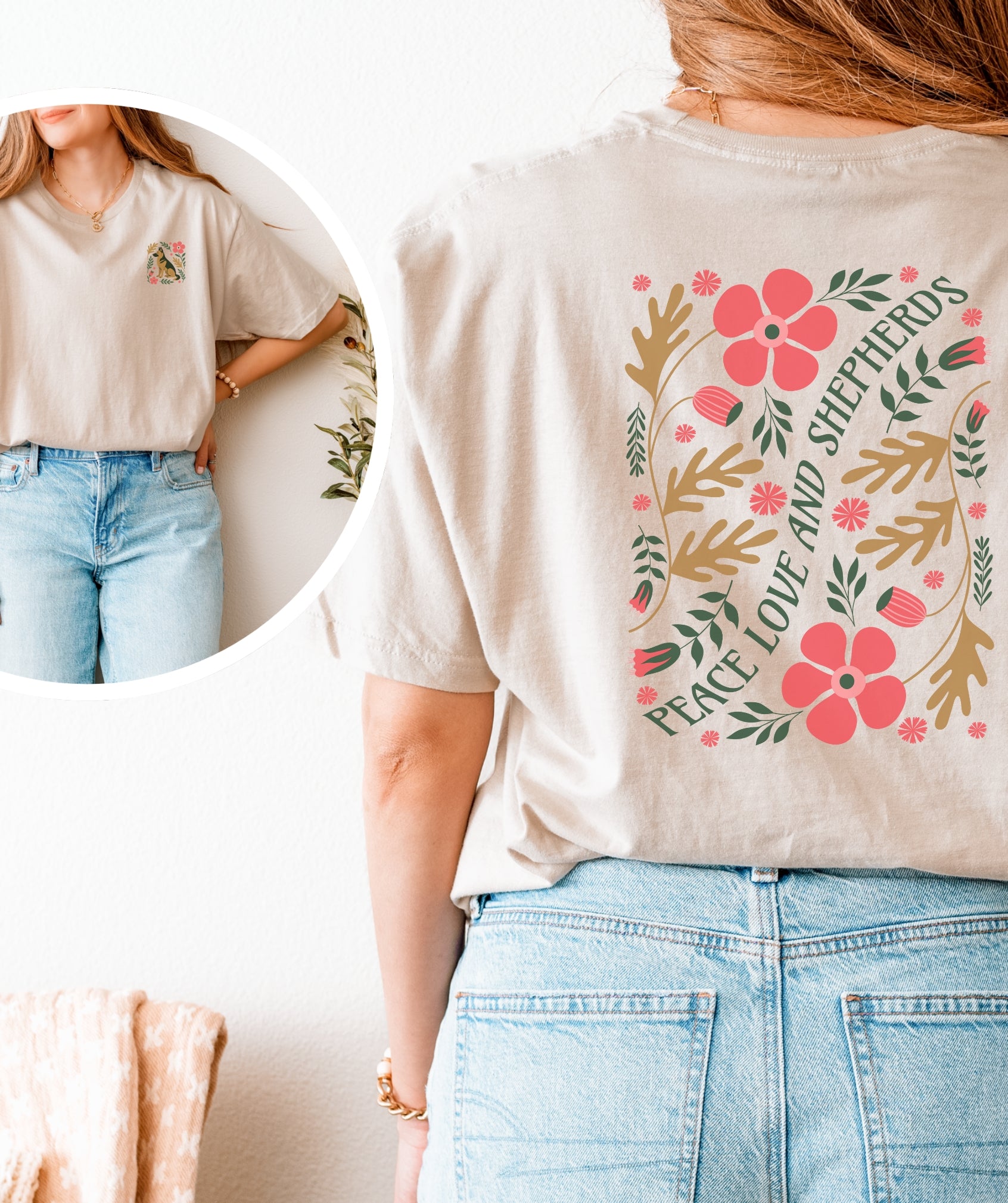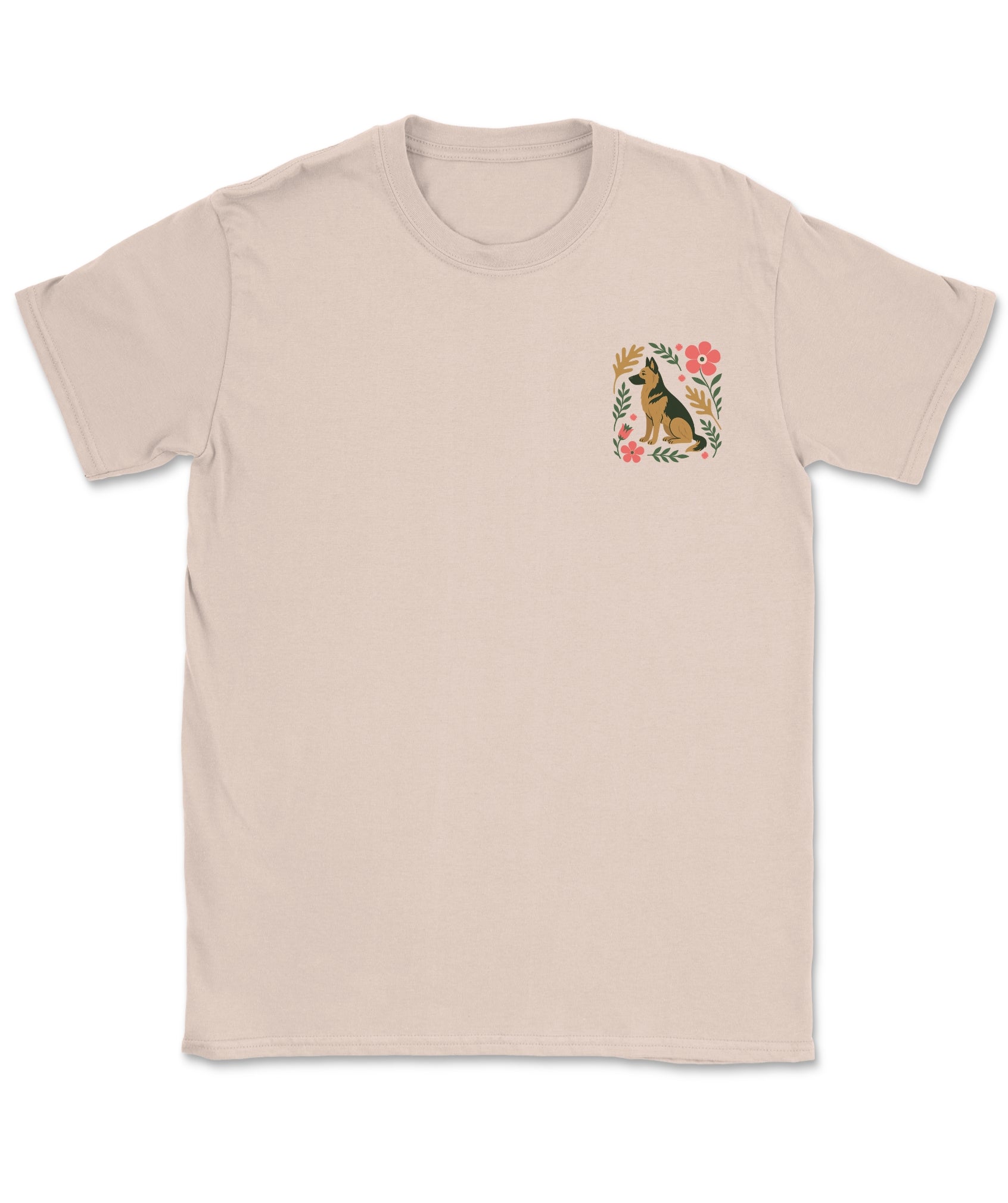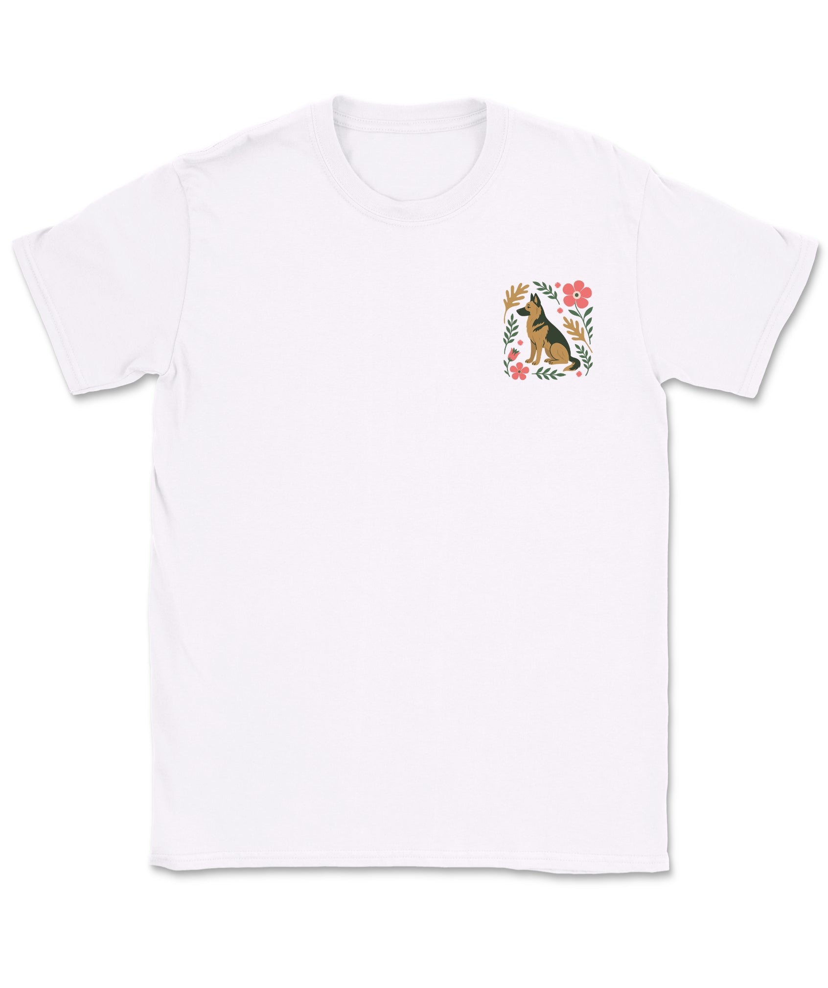 Spread good vibes with this Peace Love and Shepherds tee, featuring a sweet GSD and floral motif on the front and a full vibrant back design. Perfect for dog lovers with a boho heart.