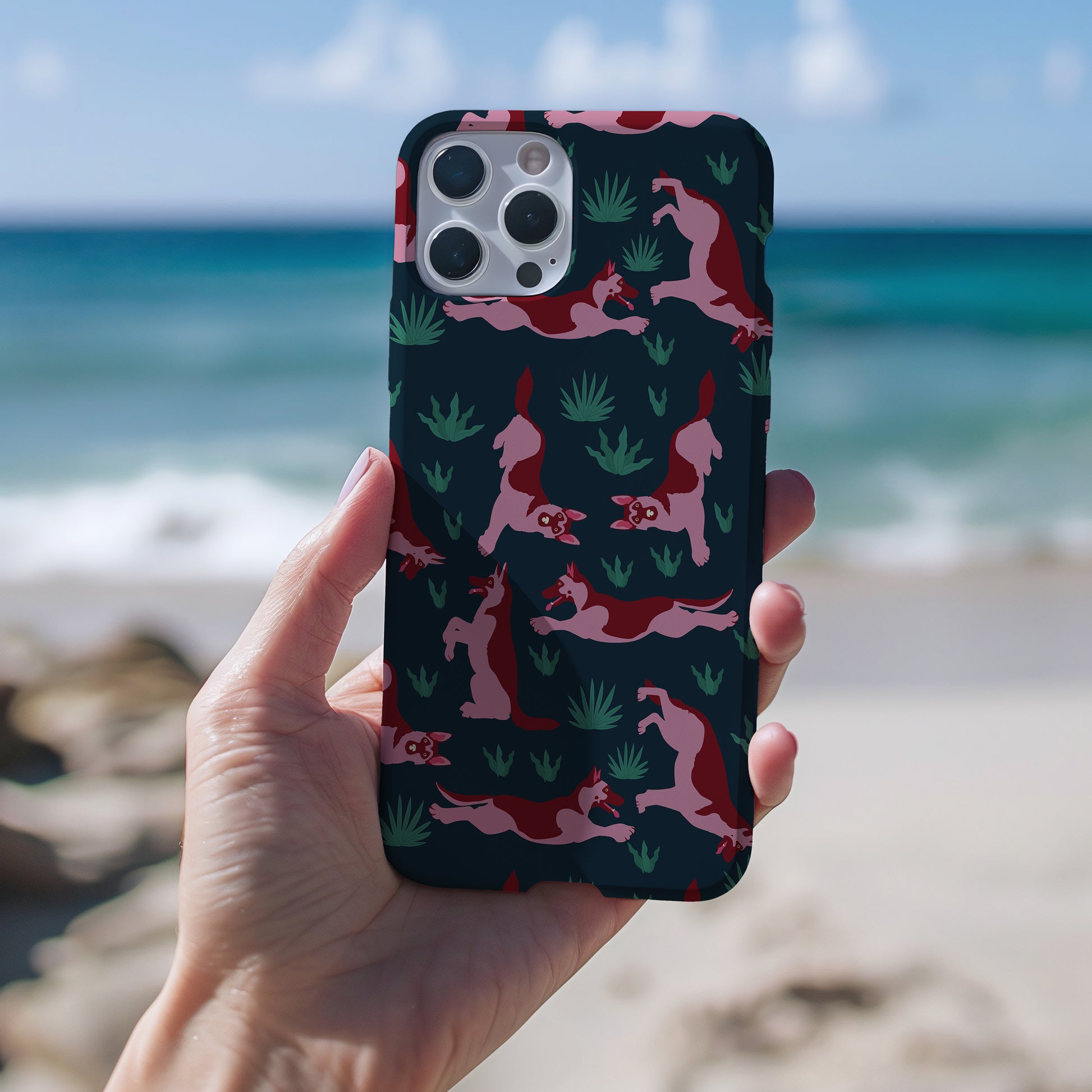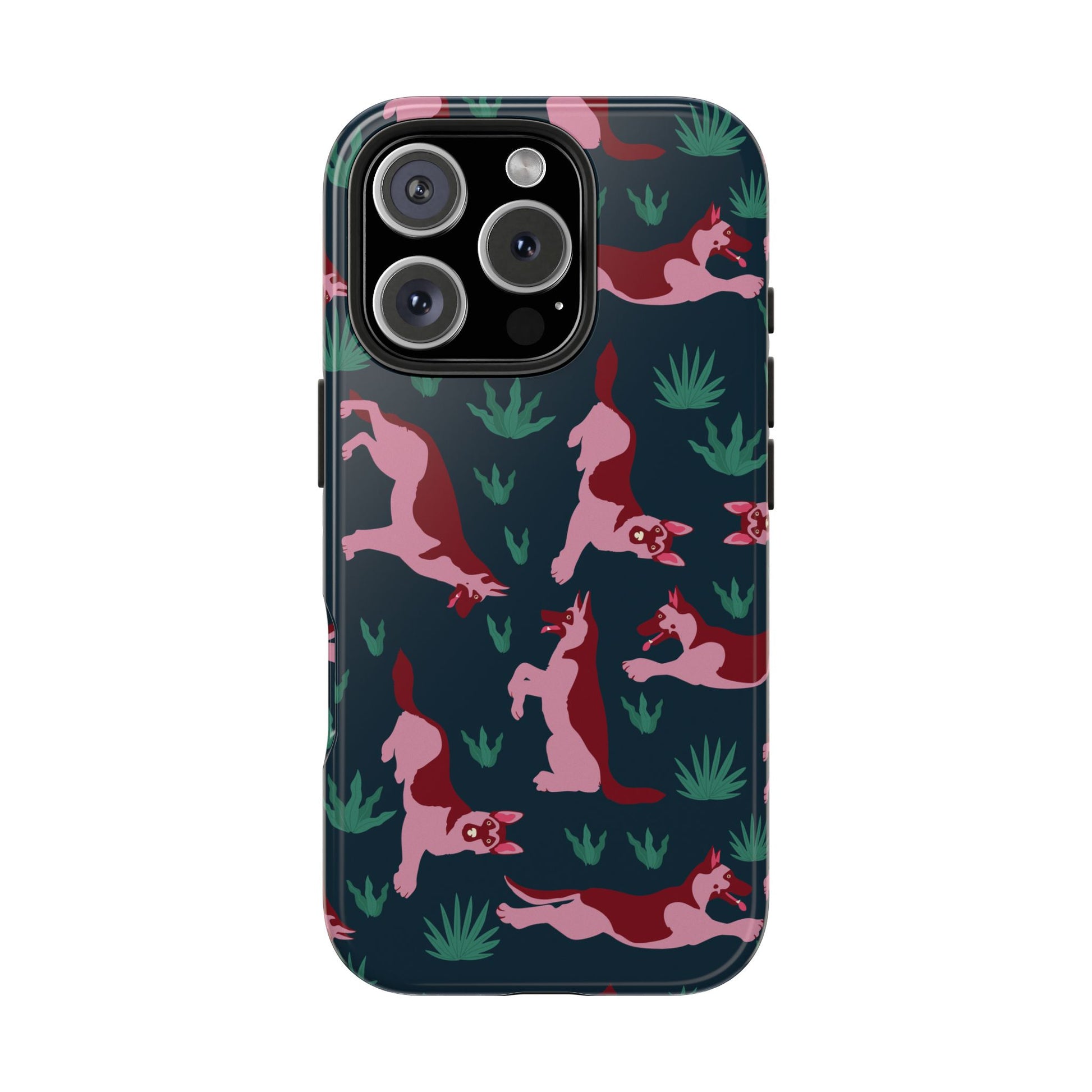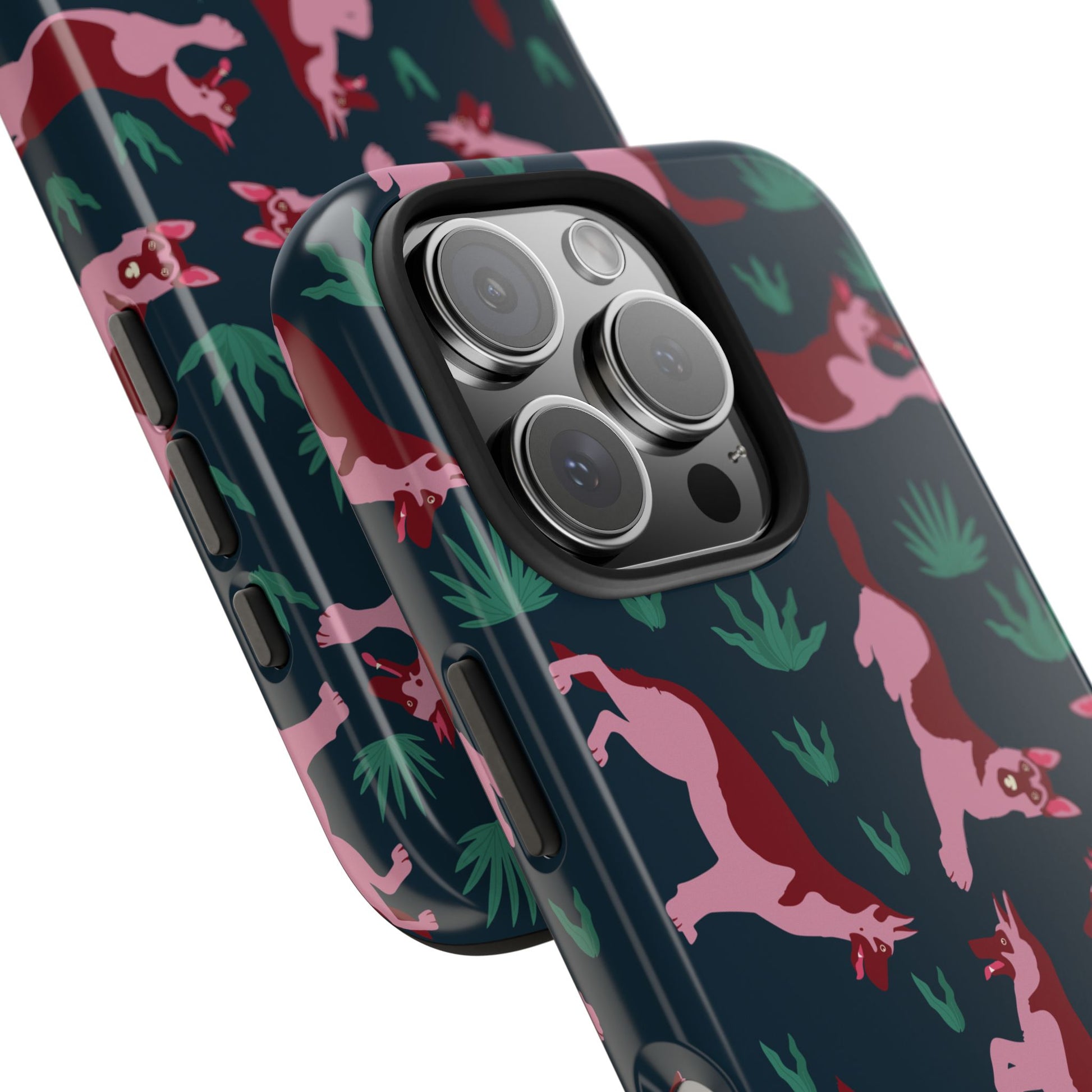 This case brings dog park vibes with a twist. Pinks, burgundies, and leafy greens pop against a rich navy backdrop, with Shepherds tumbling, leaping, and lounging like they own the place. It’s a vibrant, energetic design that’s equal parts fantasy and German Shepherd fun.