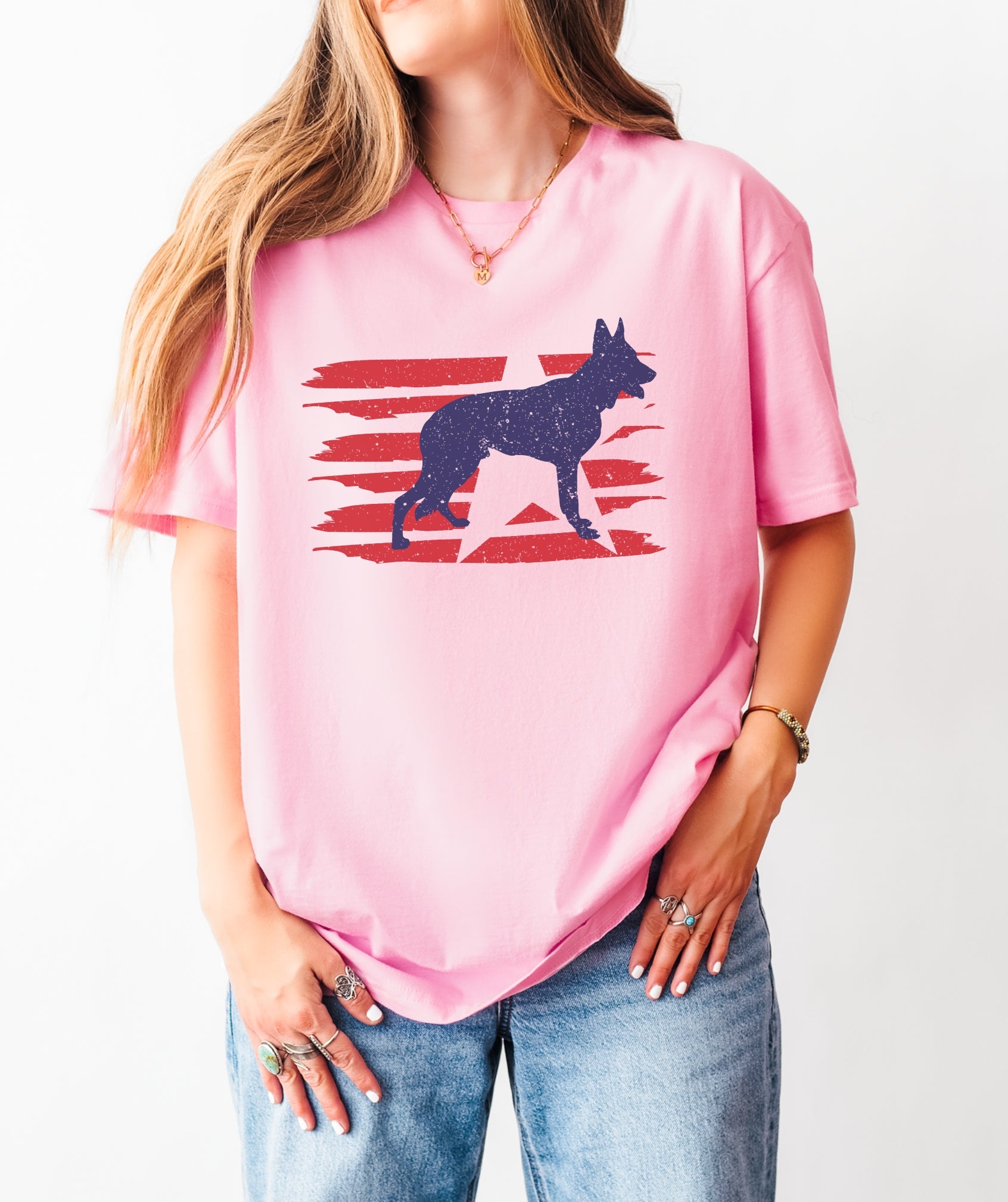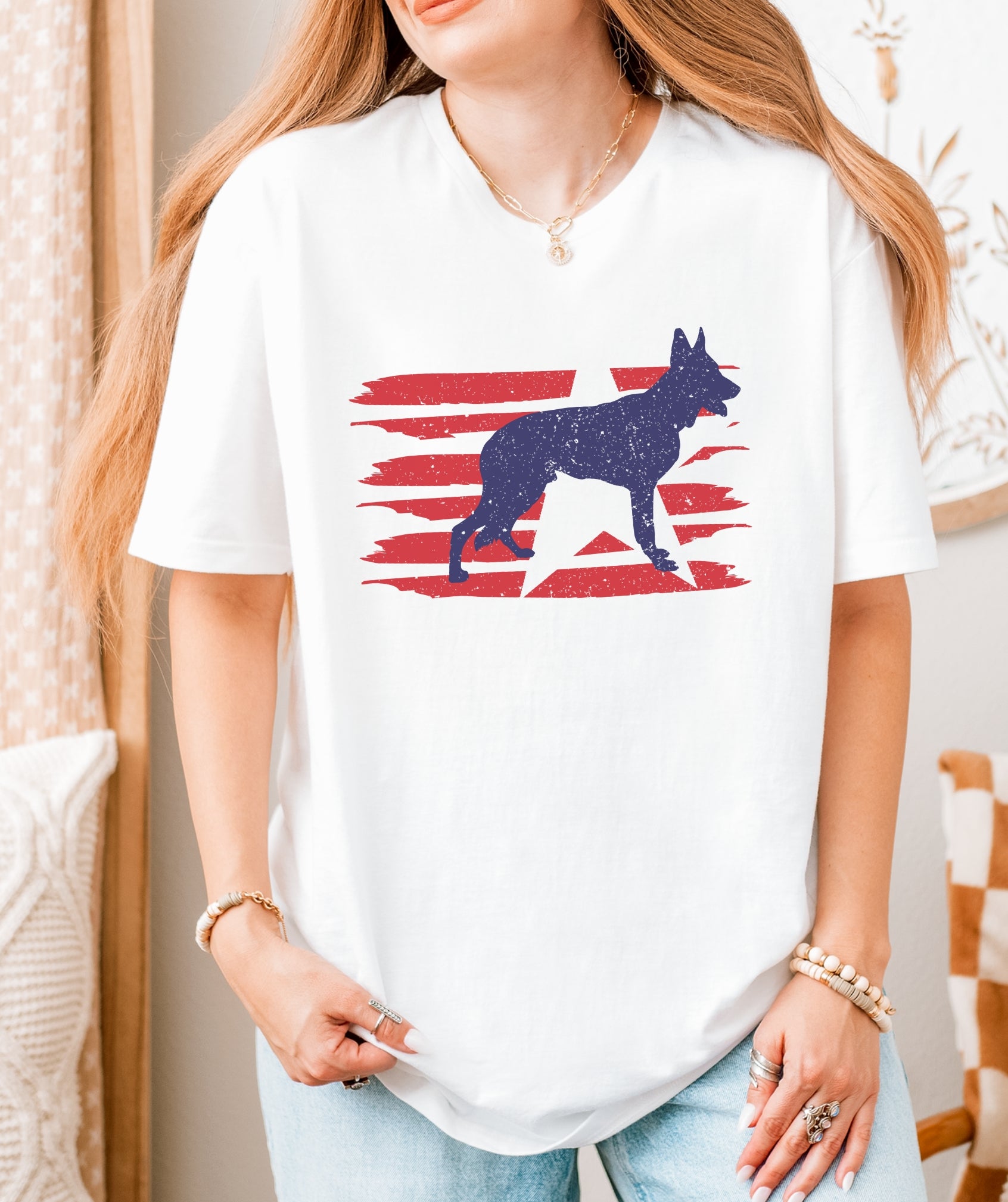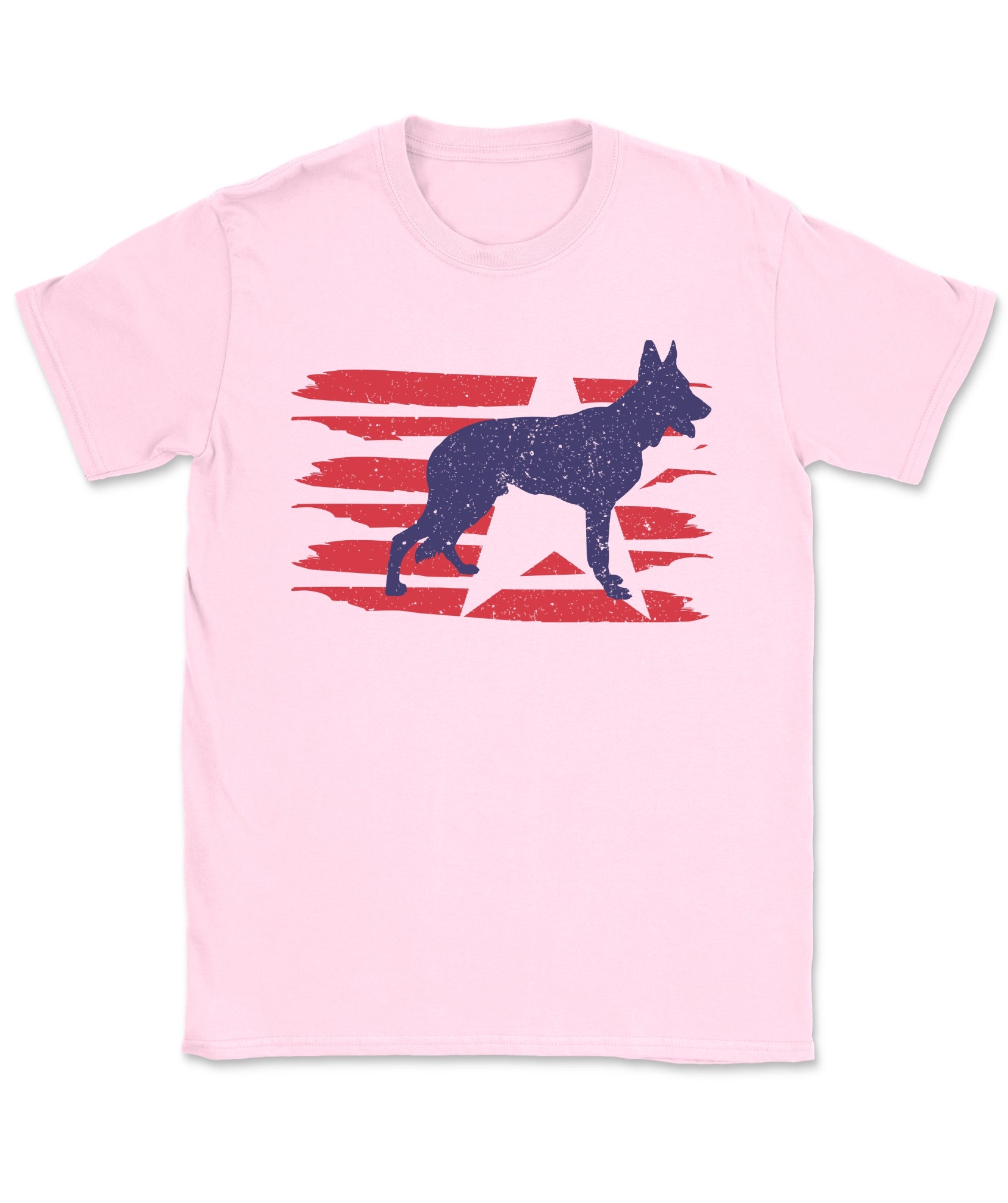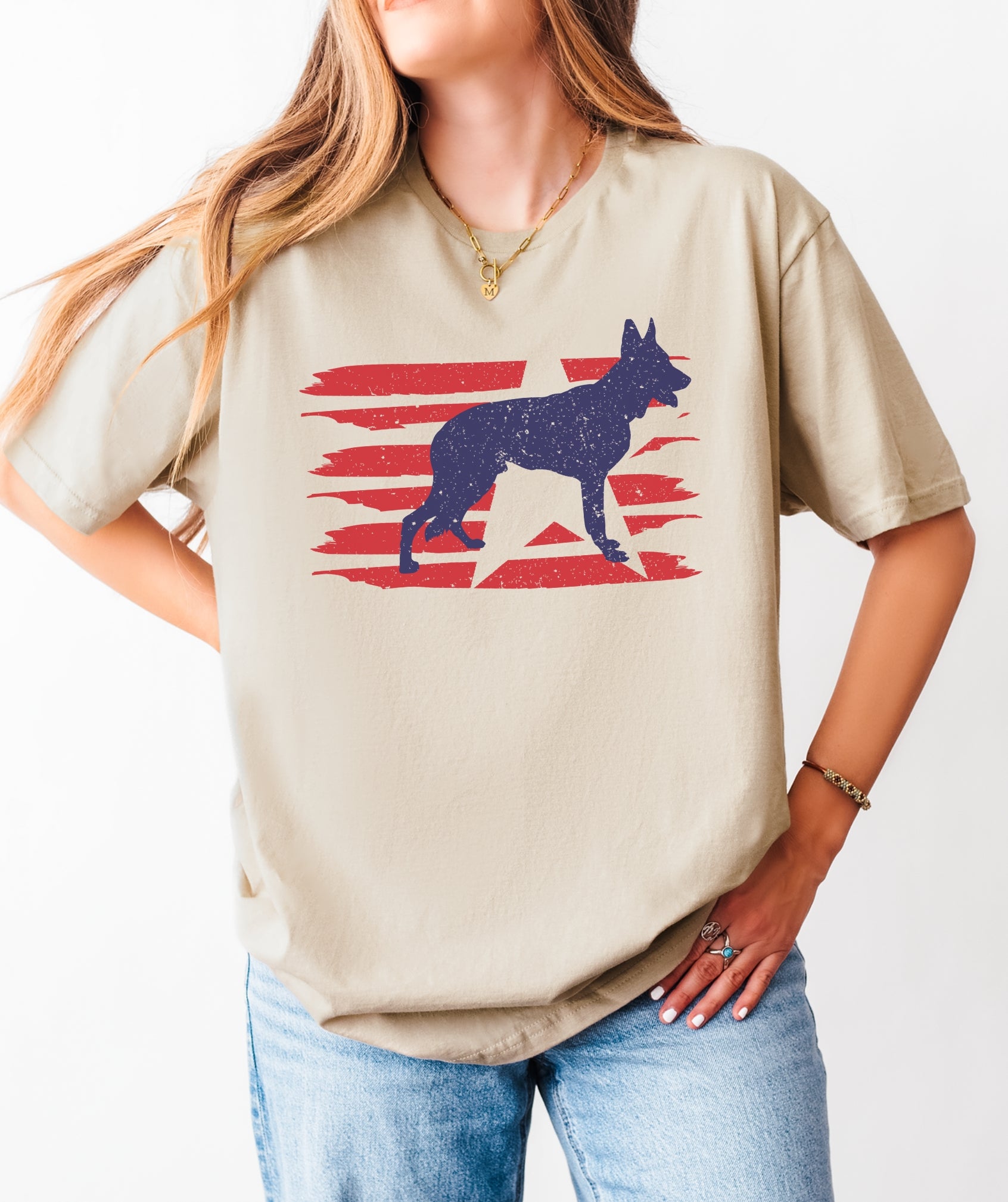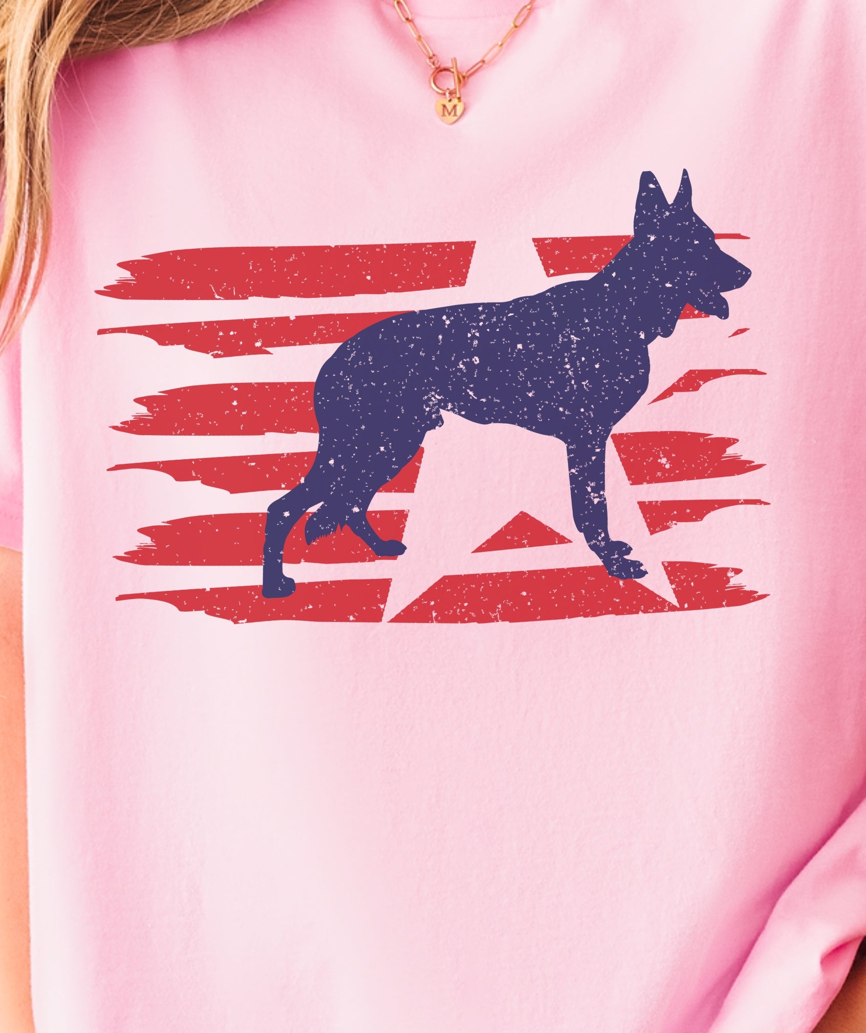 Stylized U.S. flag and German Shepherd silhouette with modern patriotic vibes
