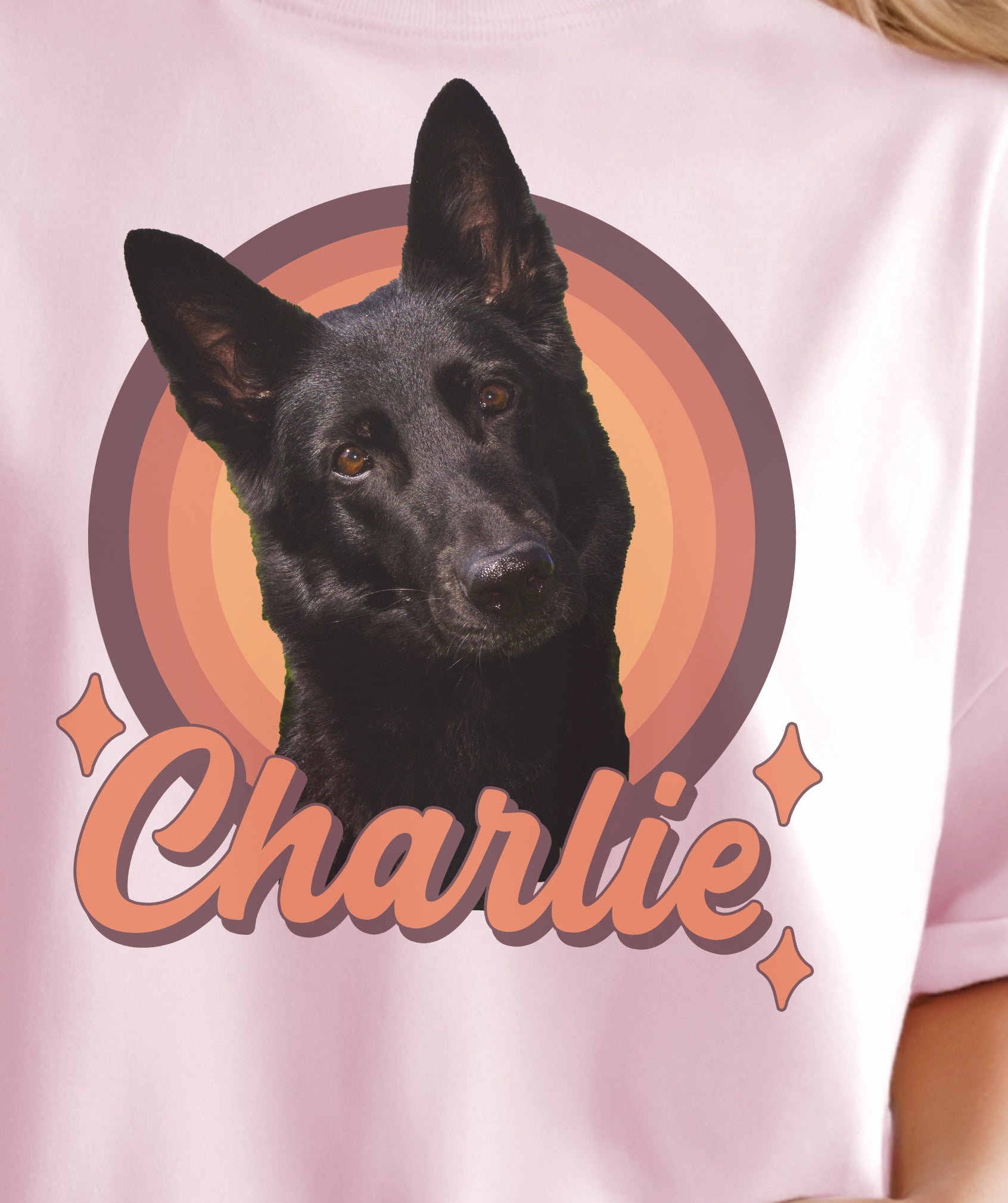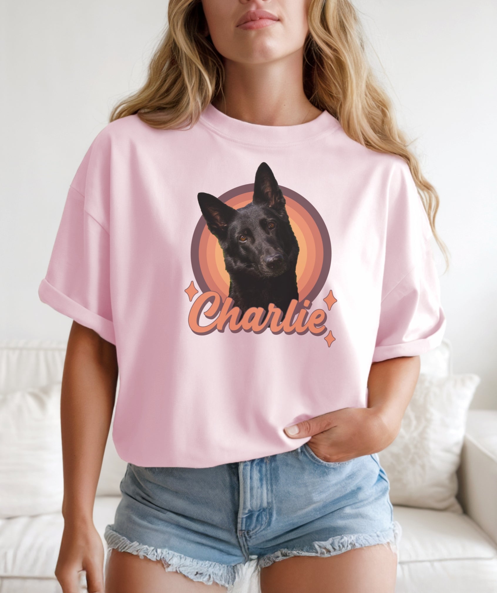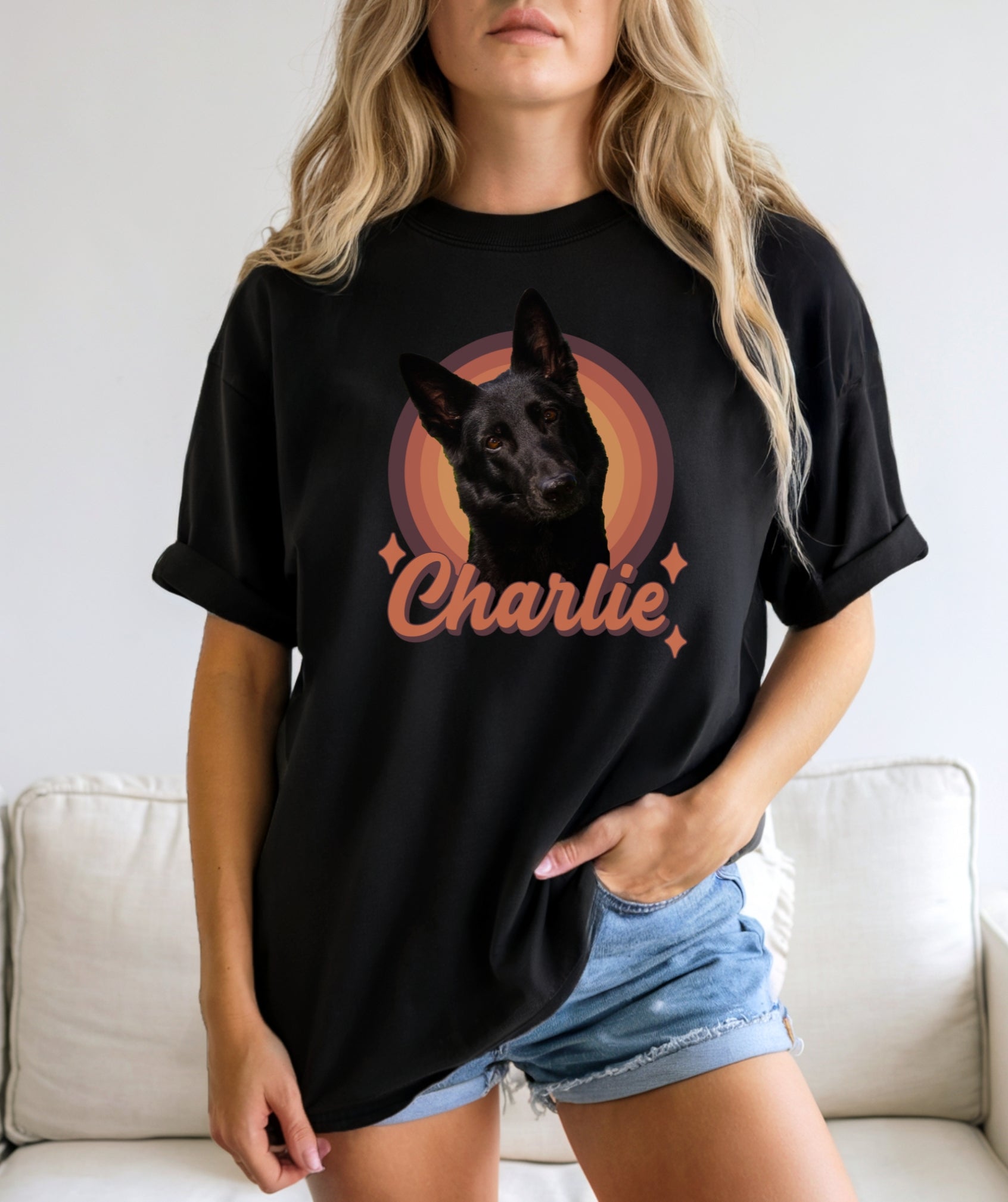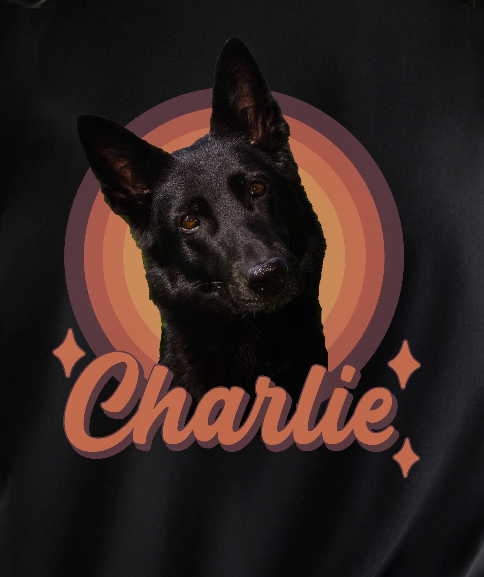 Turn your dog’s photo into a vintage-inspired tribute to the coolest pup on the block. This Retro Disco GSD design features your dog’s headshot front and center with a colorful sunset swirl and custom name in bold, funky lettering. Just send us your photo—we’ll handle the magic.