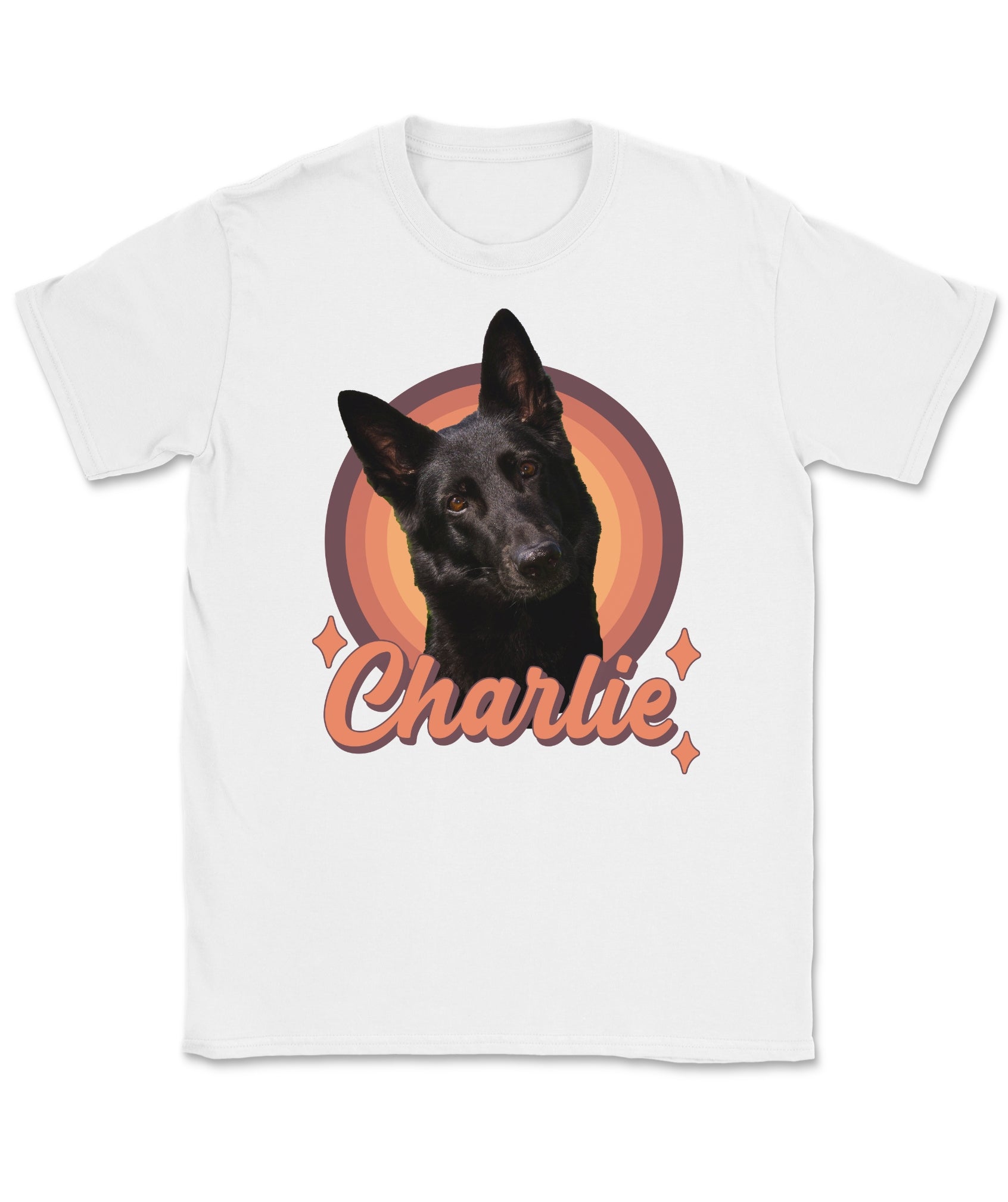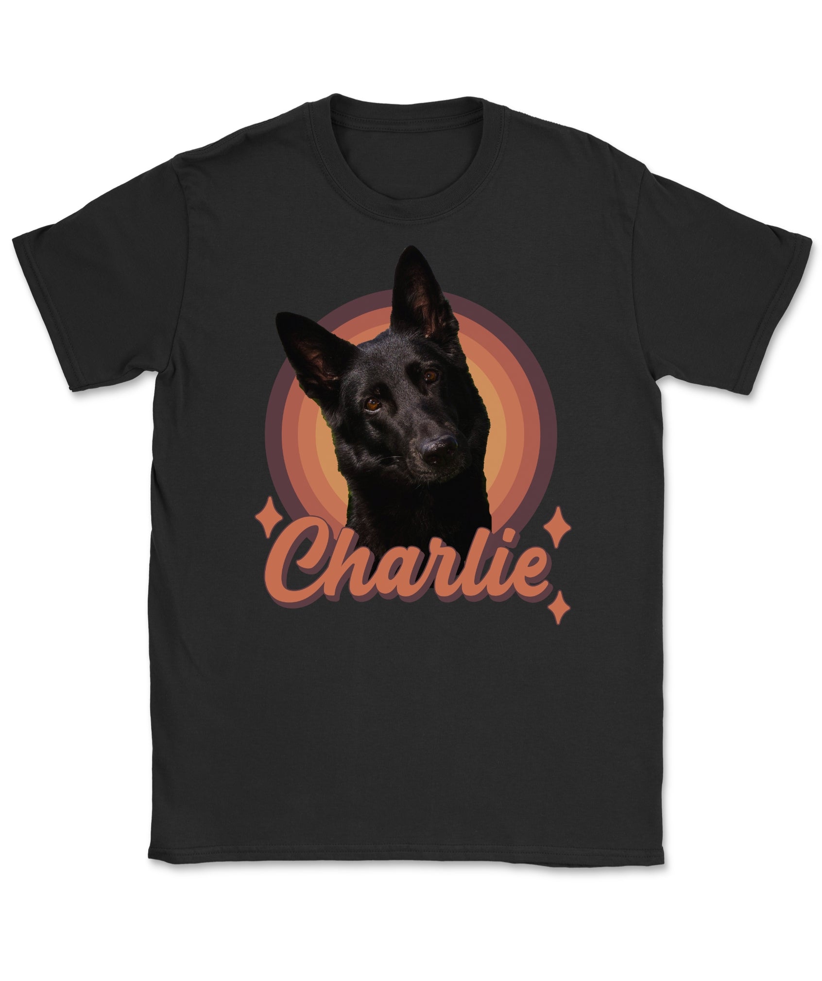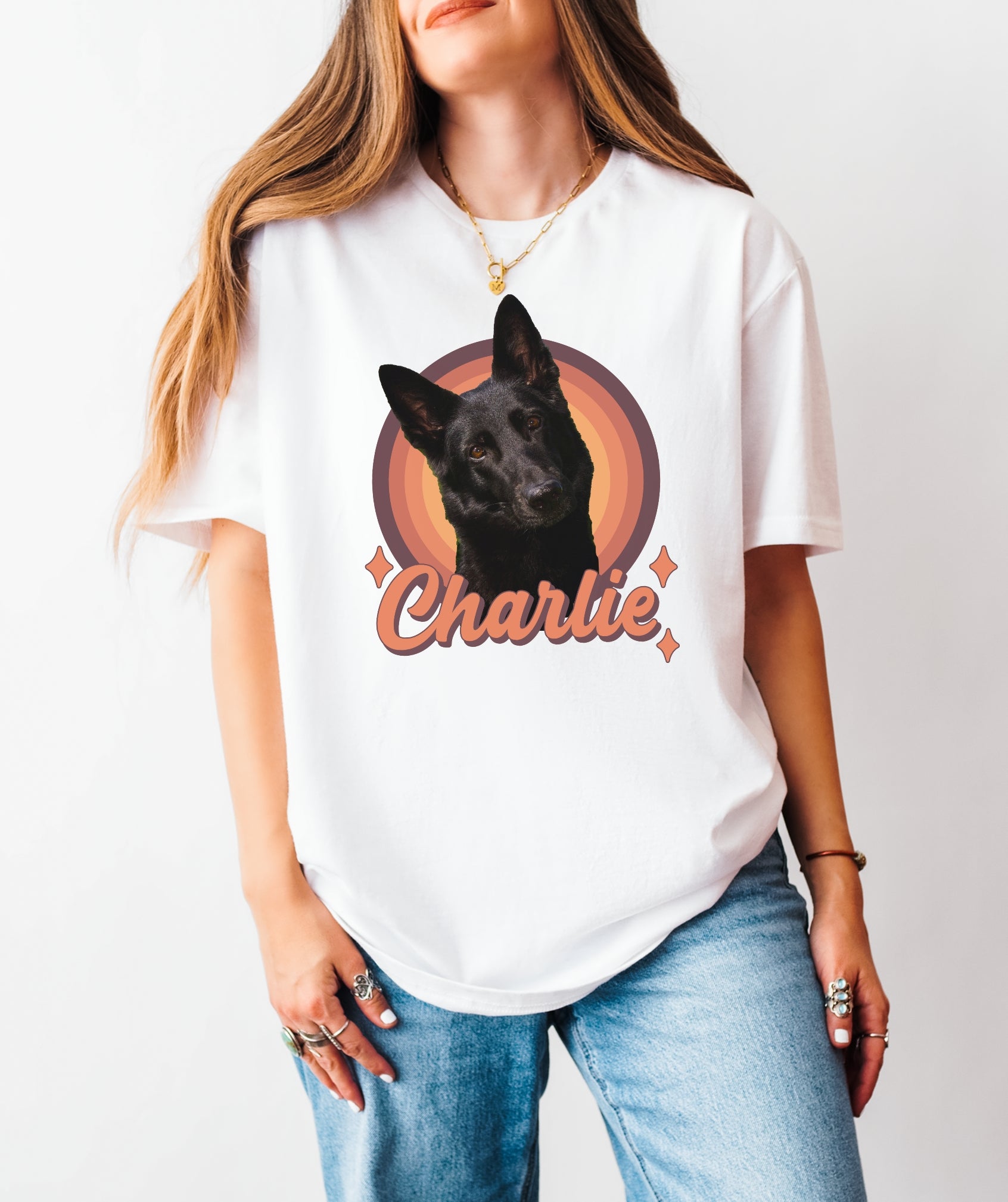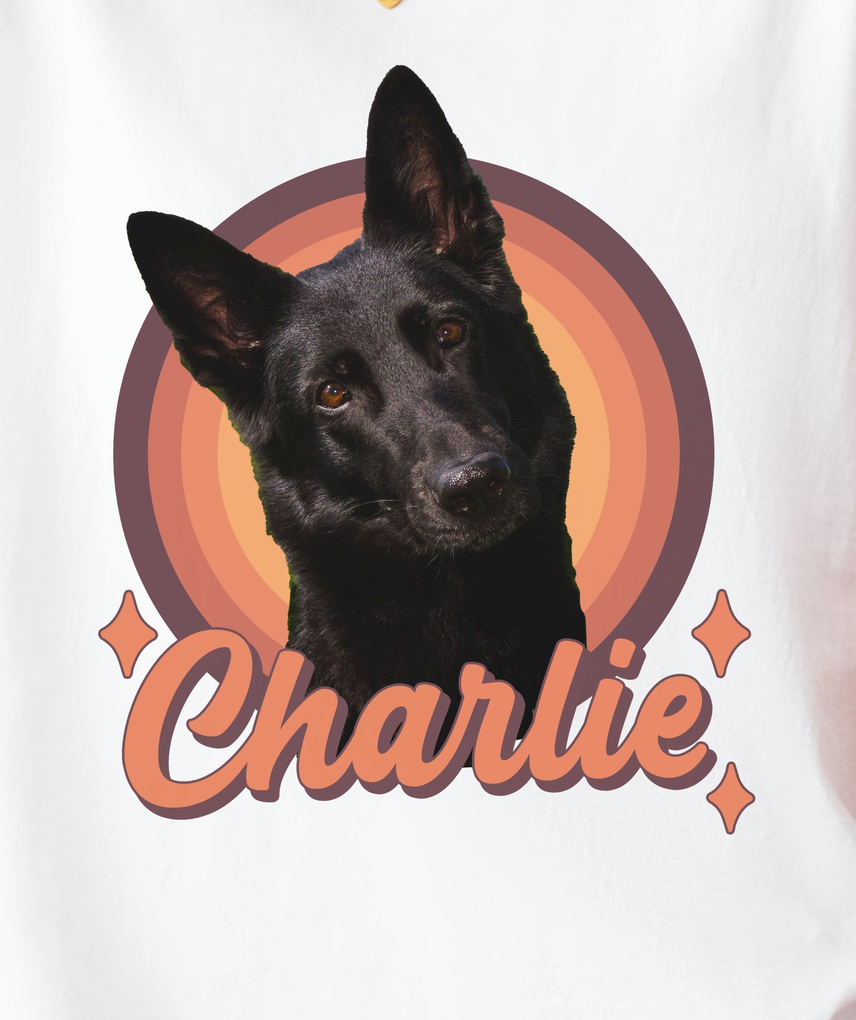 Turn your dog’s photo into a vintage-inspired tribute to the coolest pup on the block. This Retro Disco GSD design features your dog’s headshot front and center with a colorful sunset swirl and custom name in bold, funky lettering. Just send us your photo—we’ll handle the magic.