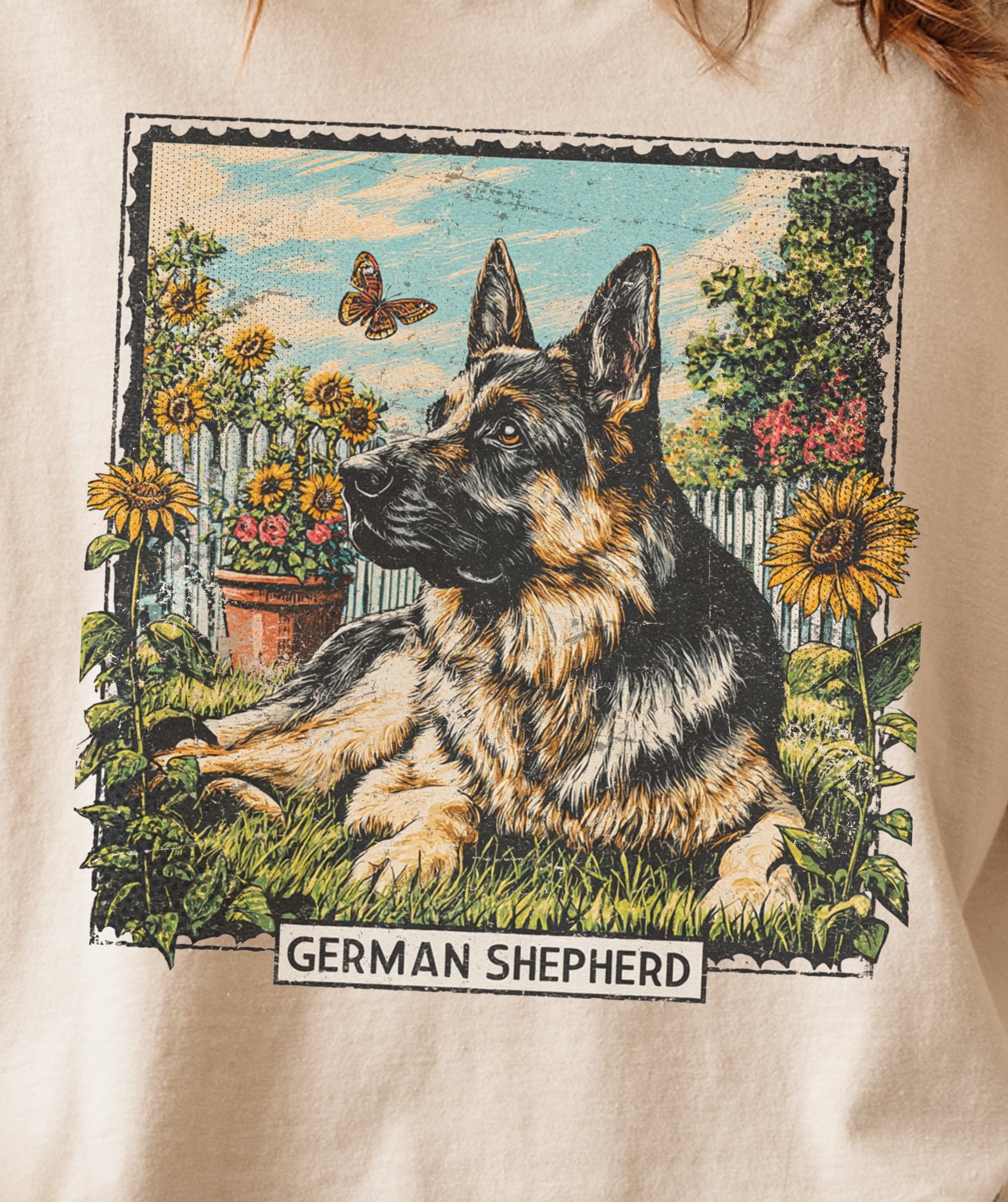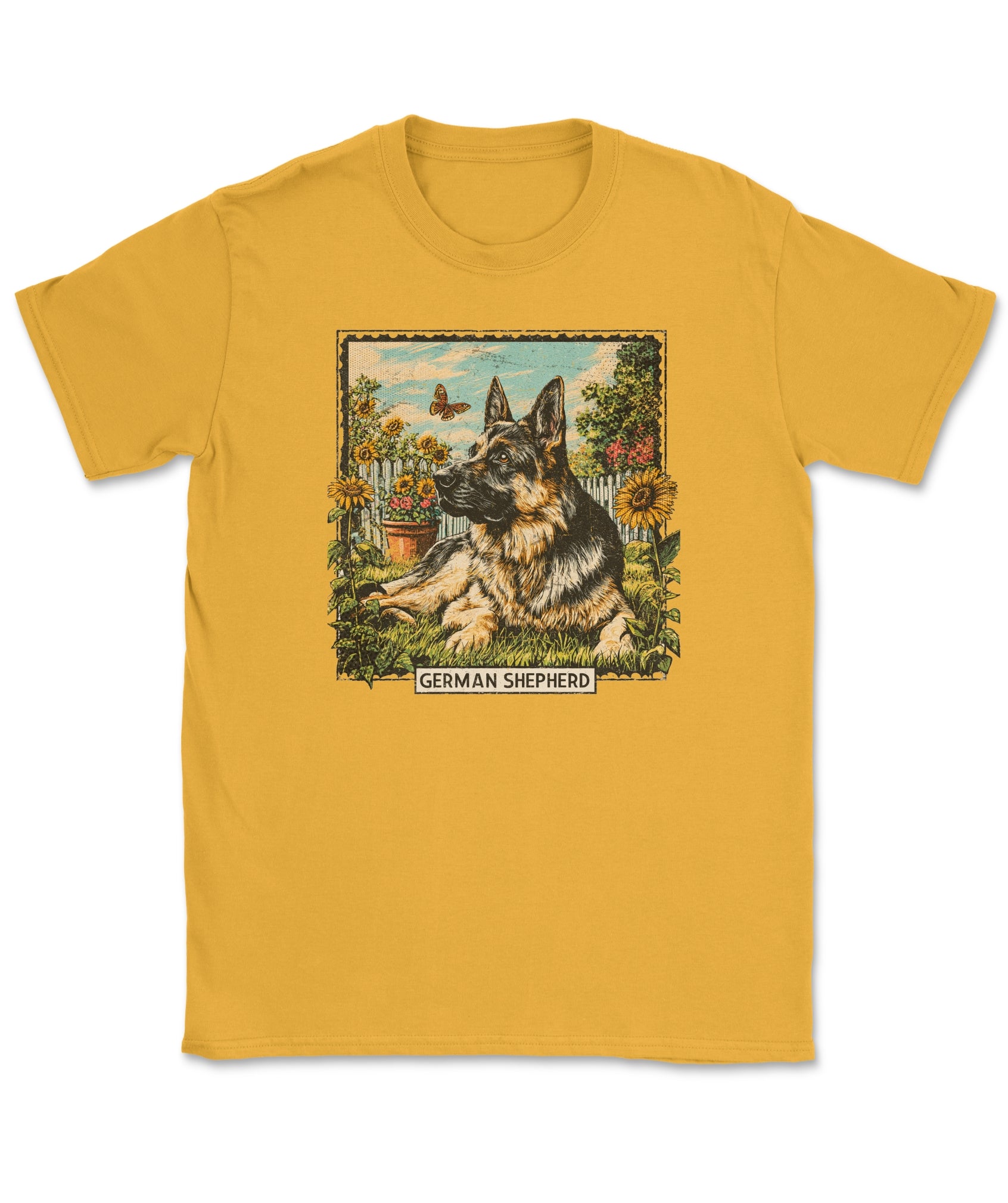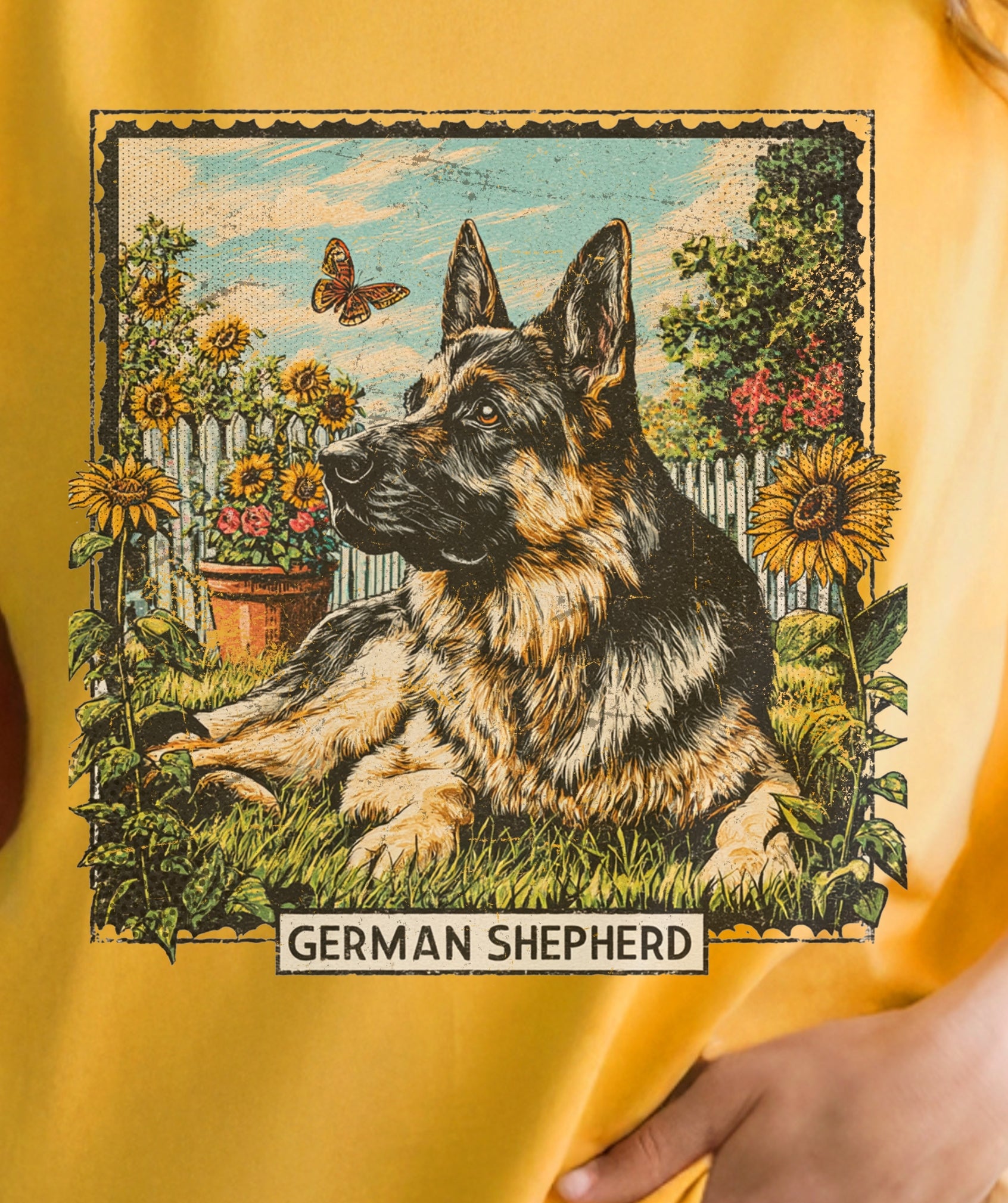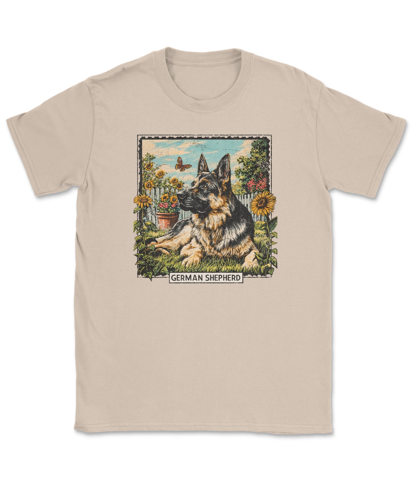 This vintage stamp-style tee captures a German Shepherd lounging in a blooming sunflower garden. With warm colors and nostalgic details, it’s a wearable postcard for dog lovers.
