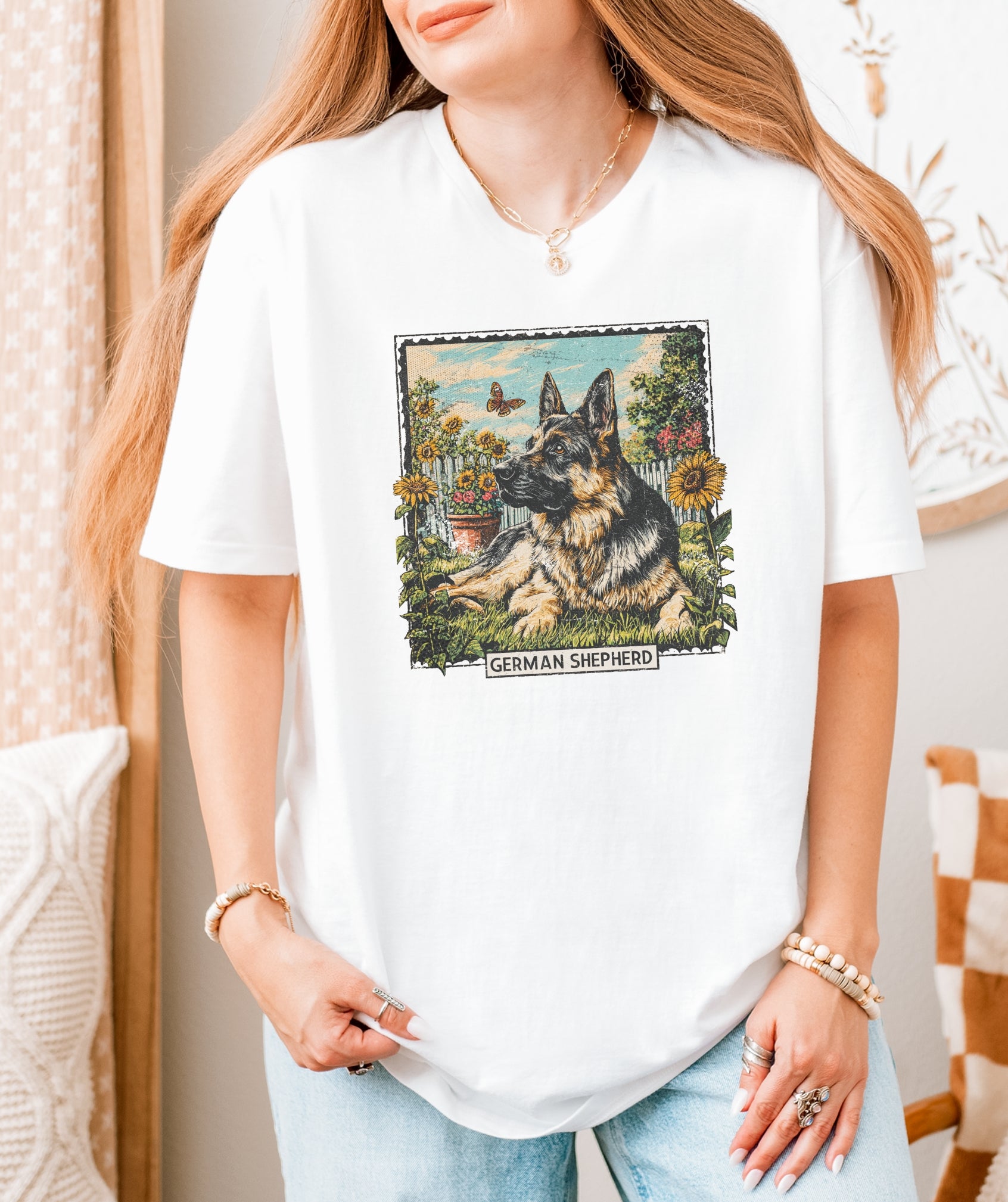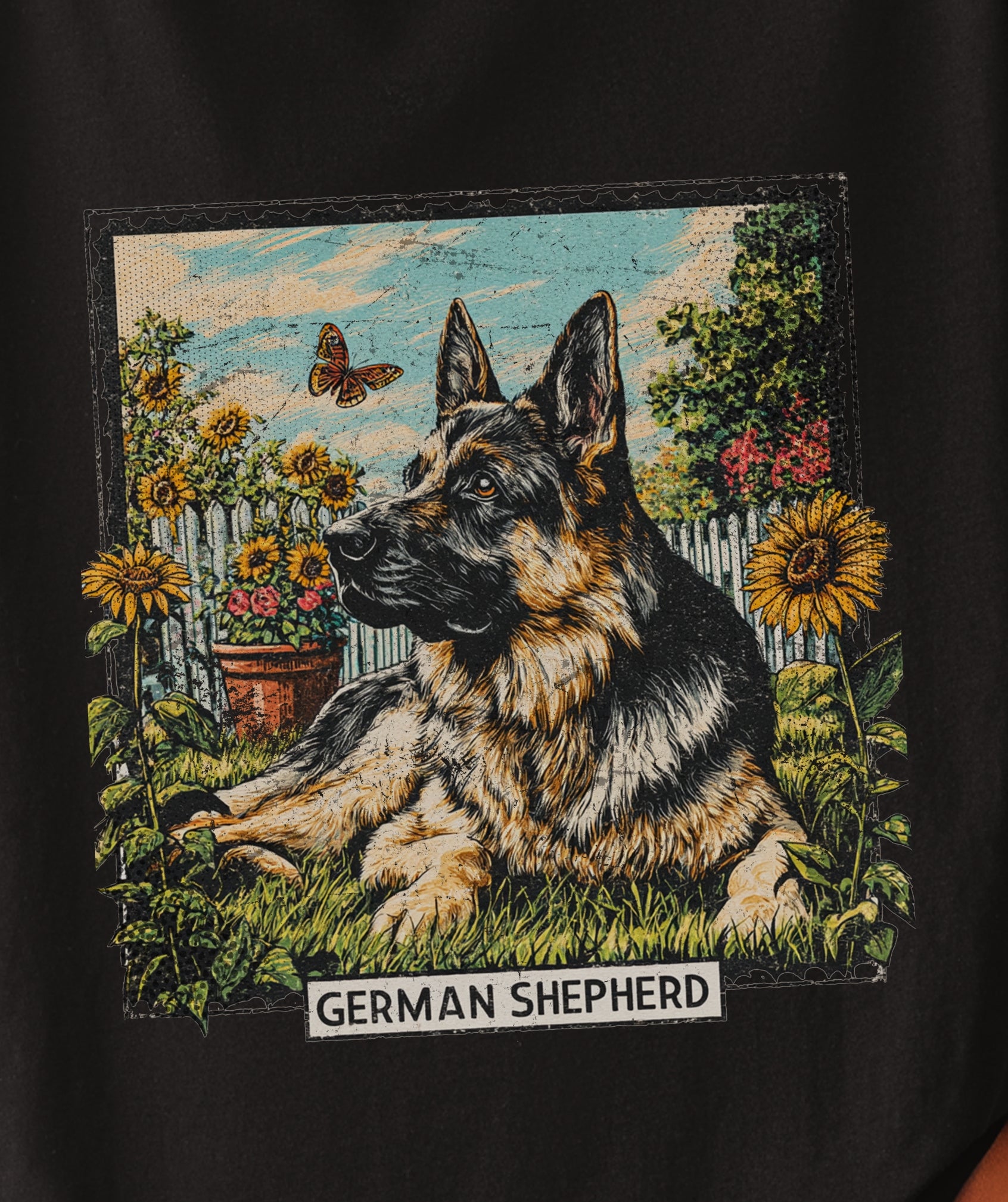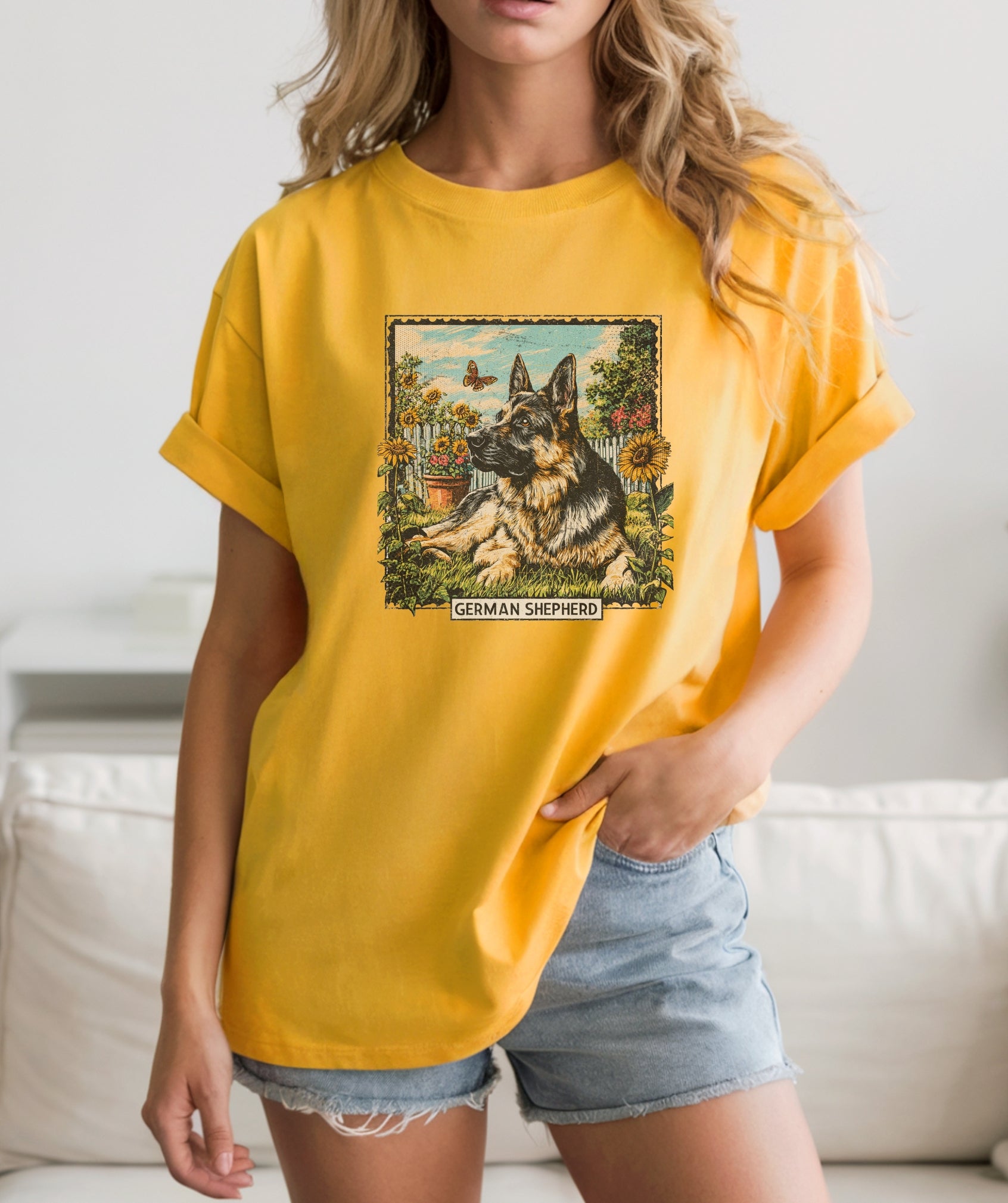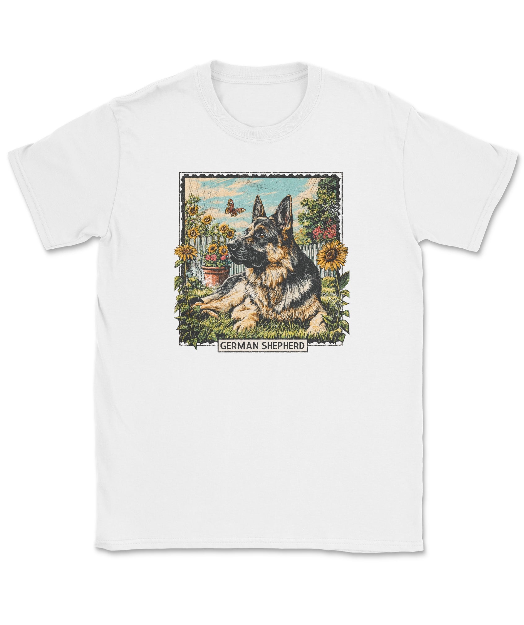 This vintage stamp-style tee captures a German Shepherd lounging in a blooming sunflower garden. With warm colors and nostalgic details, it’s a wearable postcard for dog lovers.