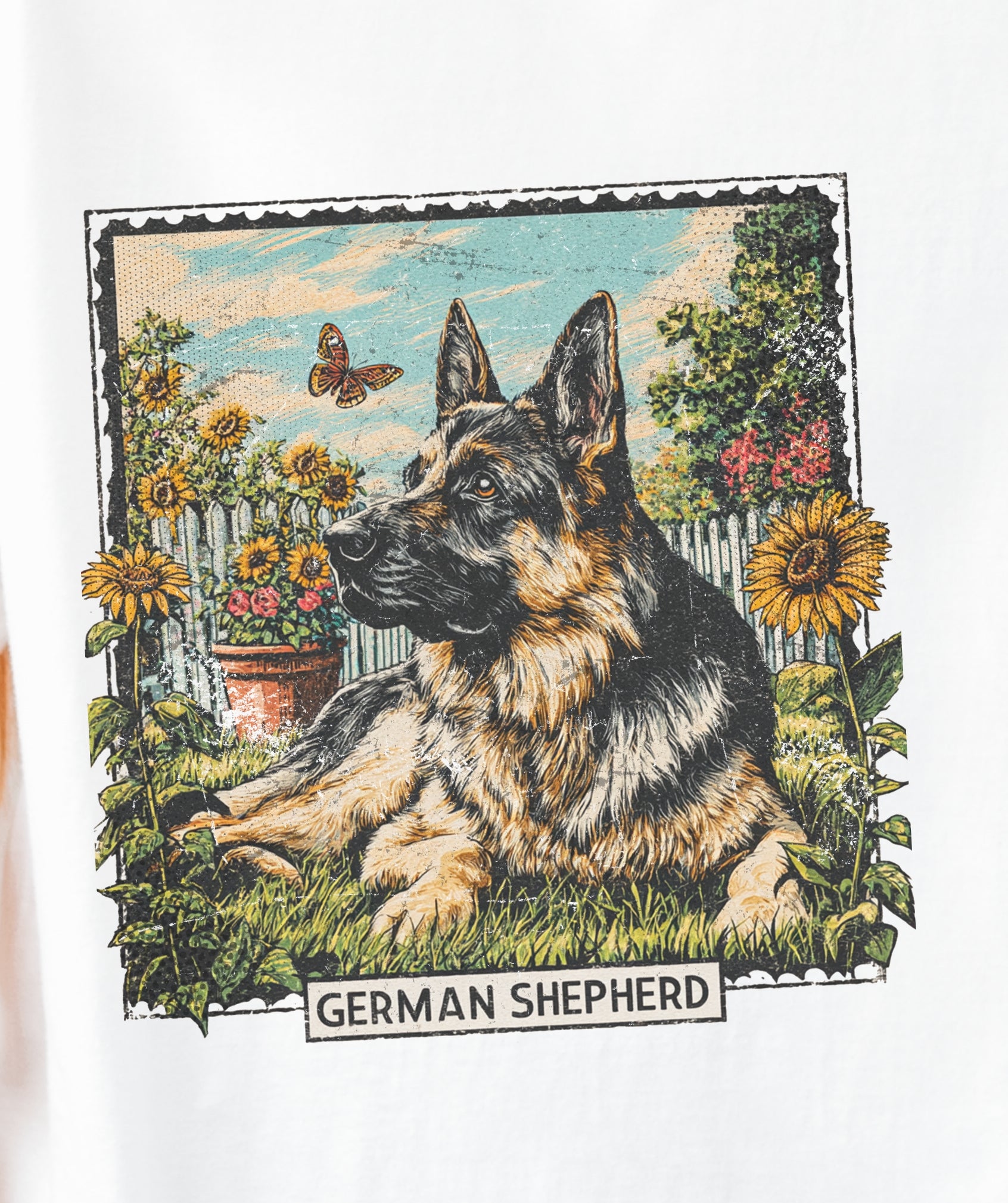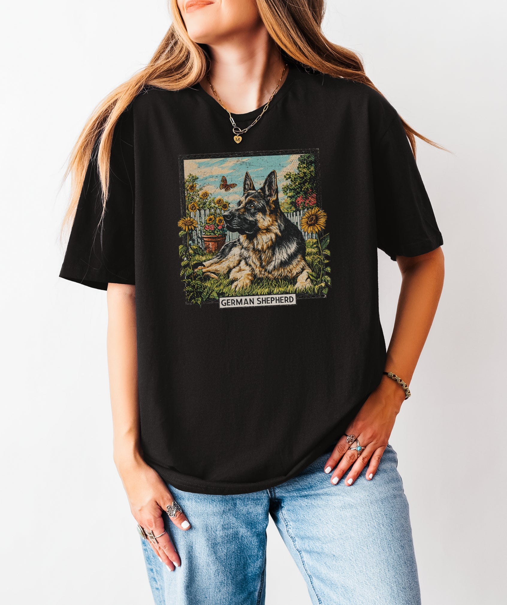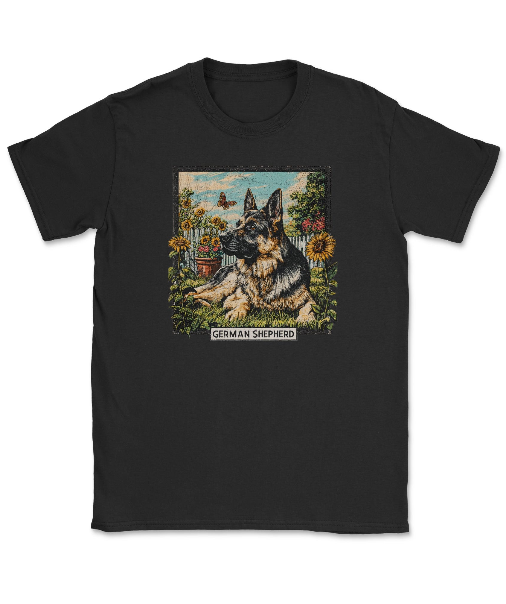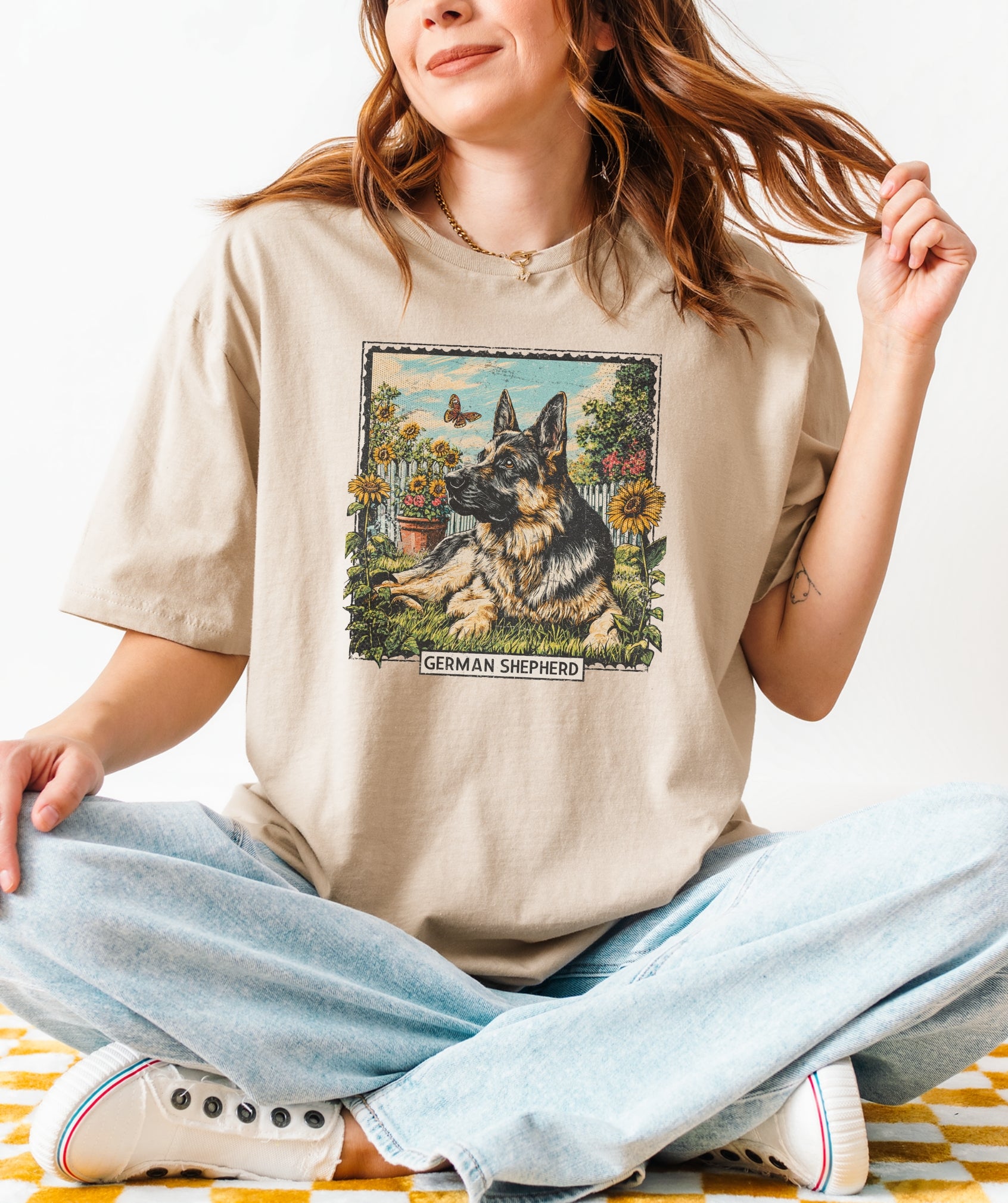 This vintage stamp-style tee captures a German Shepherd lounging in a blooming sunflower garden. With warm colors and nostalgic details, it’s a wearable postcard for dog lovers.