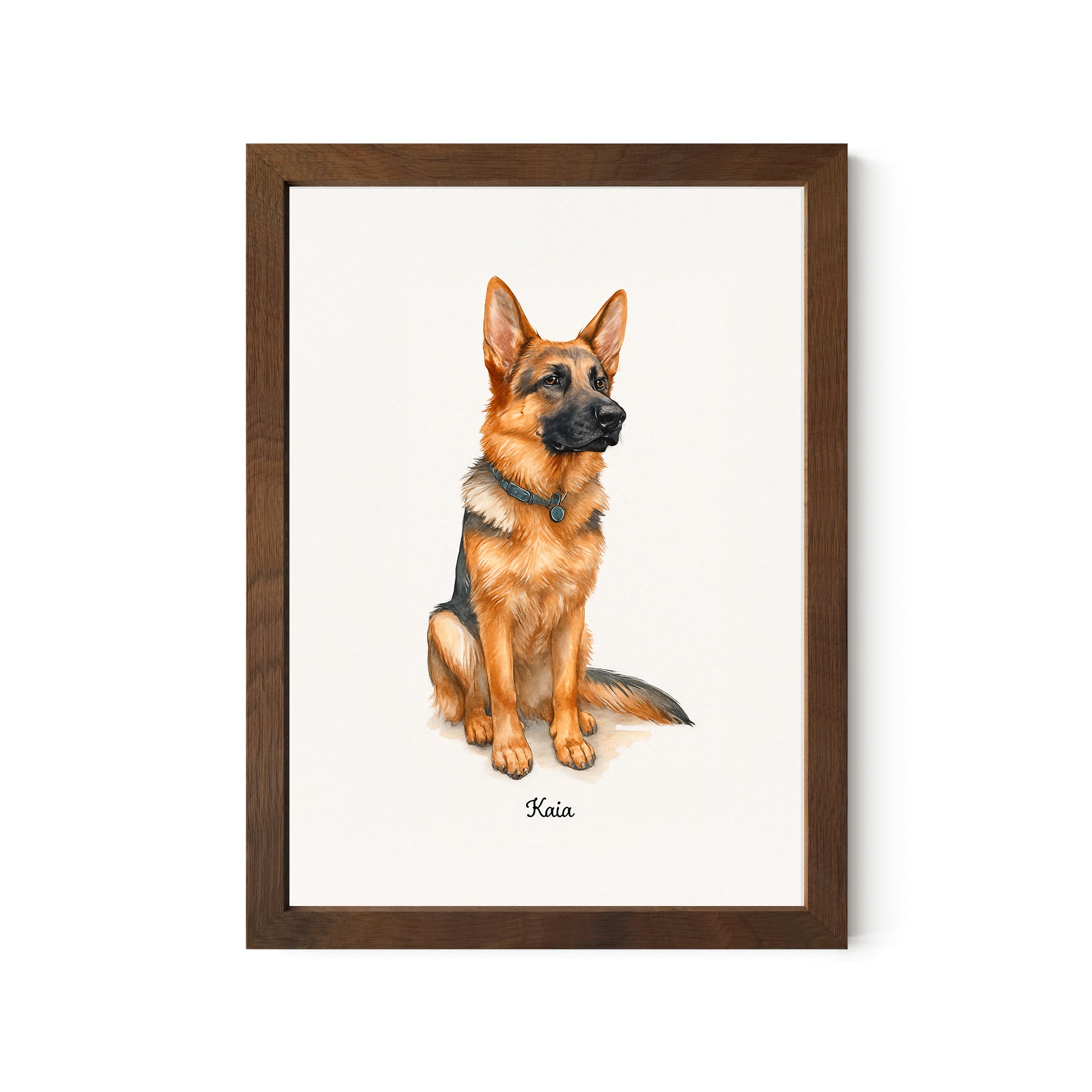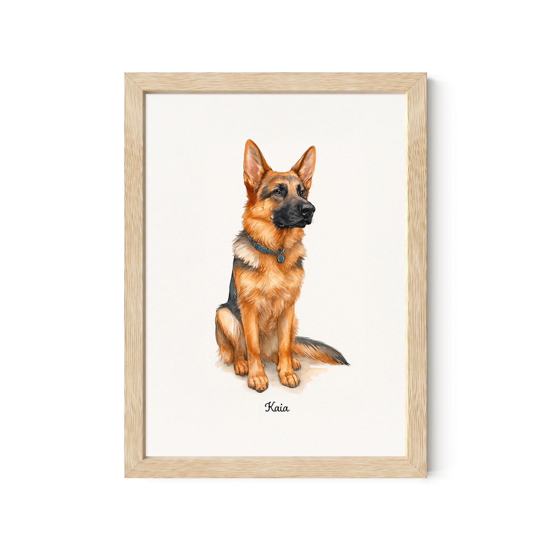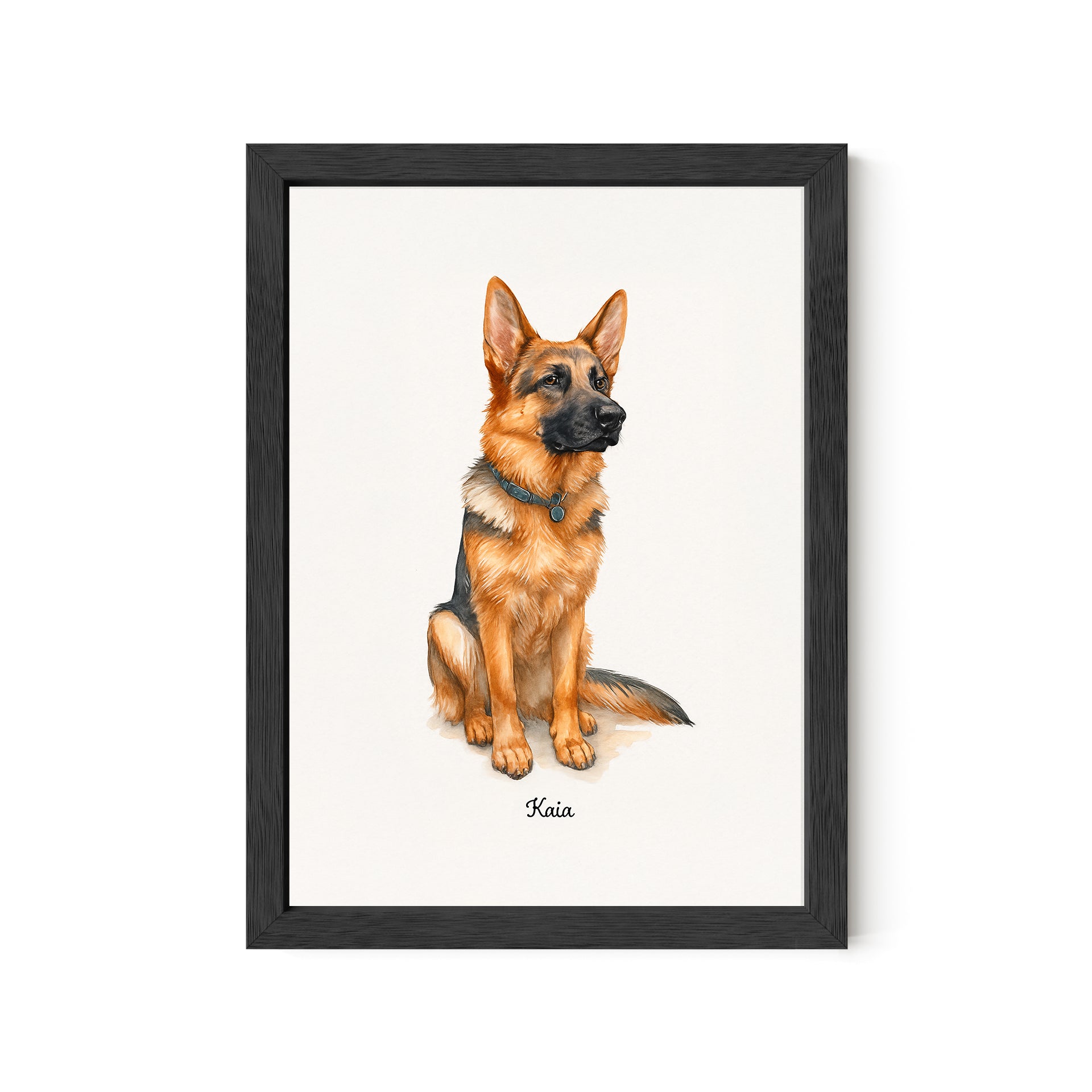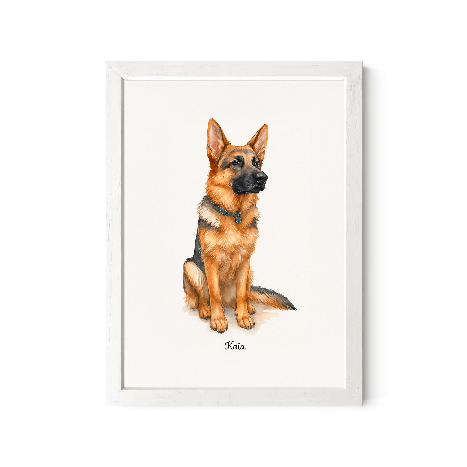 Light, heartfelt, and full of charm—this 5x7 desktop watercolor portrait brings your German Shepherd to life in painterly style. With delicate detail and a bright finish, it’s perfect for shelves, desks, and gift-giving. A sweet way to celebrate your dog, no wall space needed.